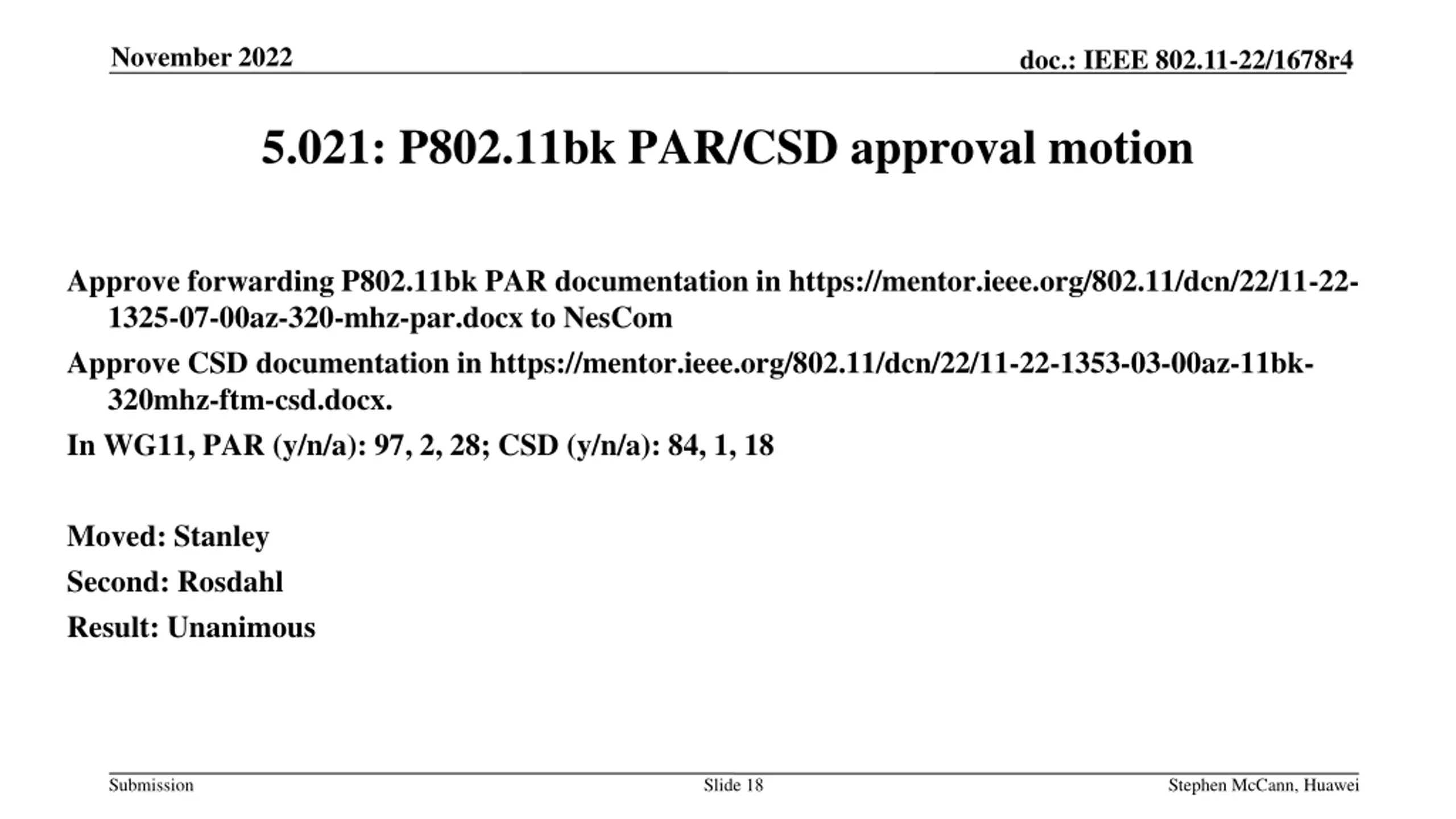 November 2022 doc.: IEEE 802.11-22/1678r4 5.021: P802.11bk PAR/CSD approval motion Approve forwarding P802.11bk PAR documentation in https://mentor.ieee.org/802.11/dcn/22/11-22- 1325-07-00az-320-mhz-par.docx to NesCom Approve CSD documentation in https://mentor.ieee.org/802.11/dcn/22/11-22-1353-03-00az-11bk- 320mhz-ftm-csd.docx. In WG11, PAR (y/n/a): 97, 2, 28; CSD (y/n/a): 84, 1, 18 Moved: Stanley Second: Rosdahl Result: Unanimous Submission Slide 18 Stephen McCann, Huawei