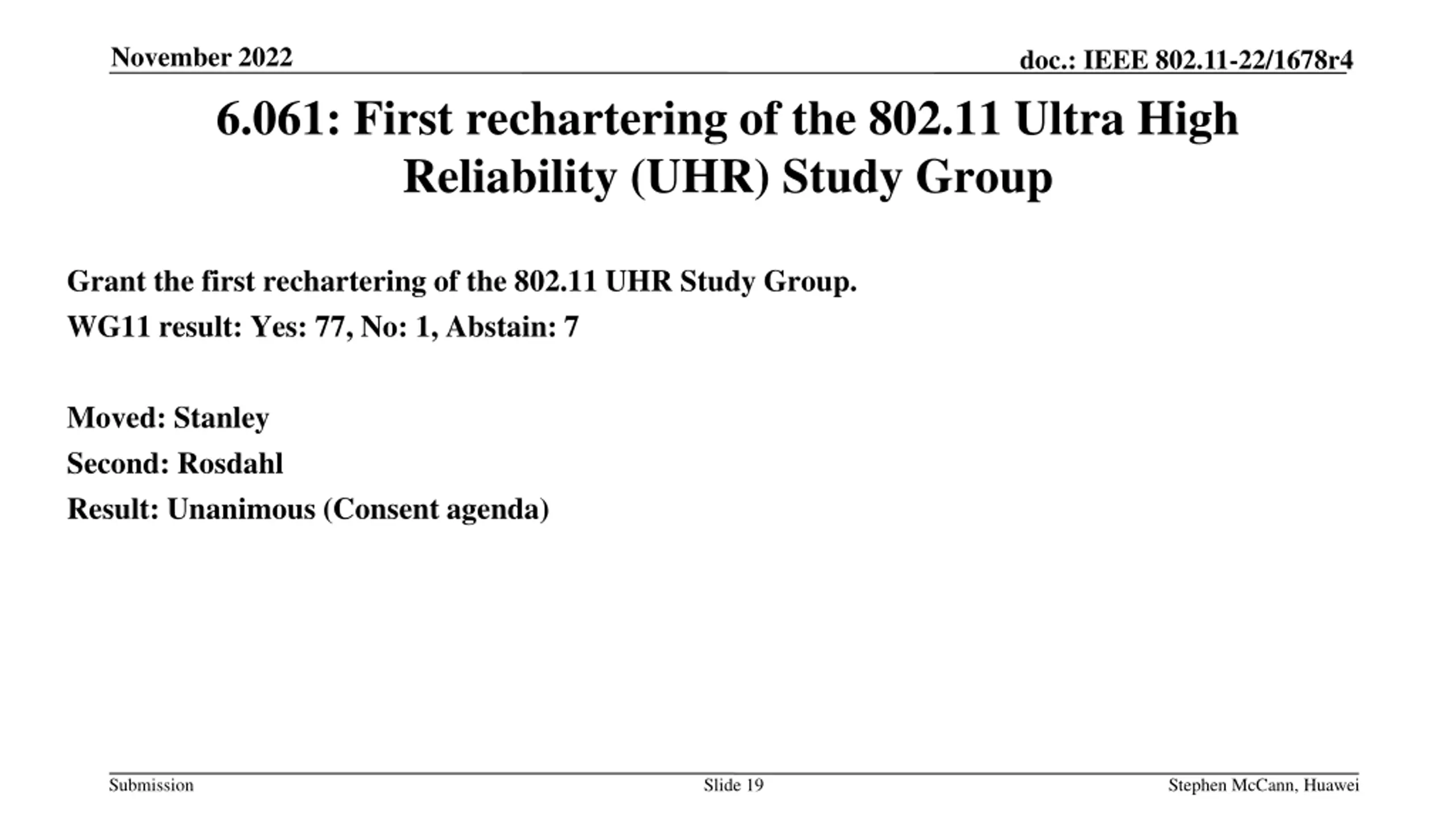 November 2022 doc.: IEEE 802.11-22/1678r4 6.061: First rechartering of the 802.11 Ultra High Reliability (UHR) Study Group Grant the first rechartering of the 802.11 UHR Study Group. WG11 result: Yes: 77, No: 1, Abstain: 7 Moved: Stanley Second: Rosdahl Result: Unanimous (Consent agenda) Submission Slide 19 Stephen McCann, Huawei