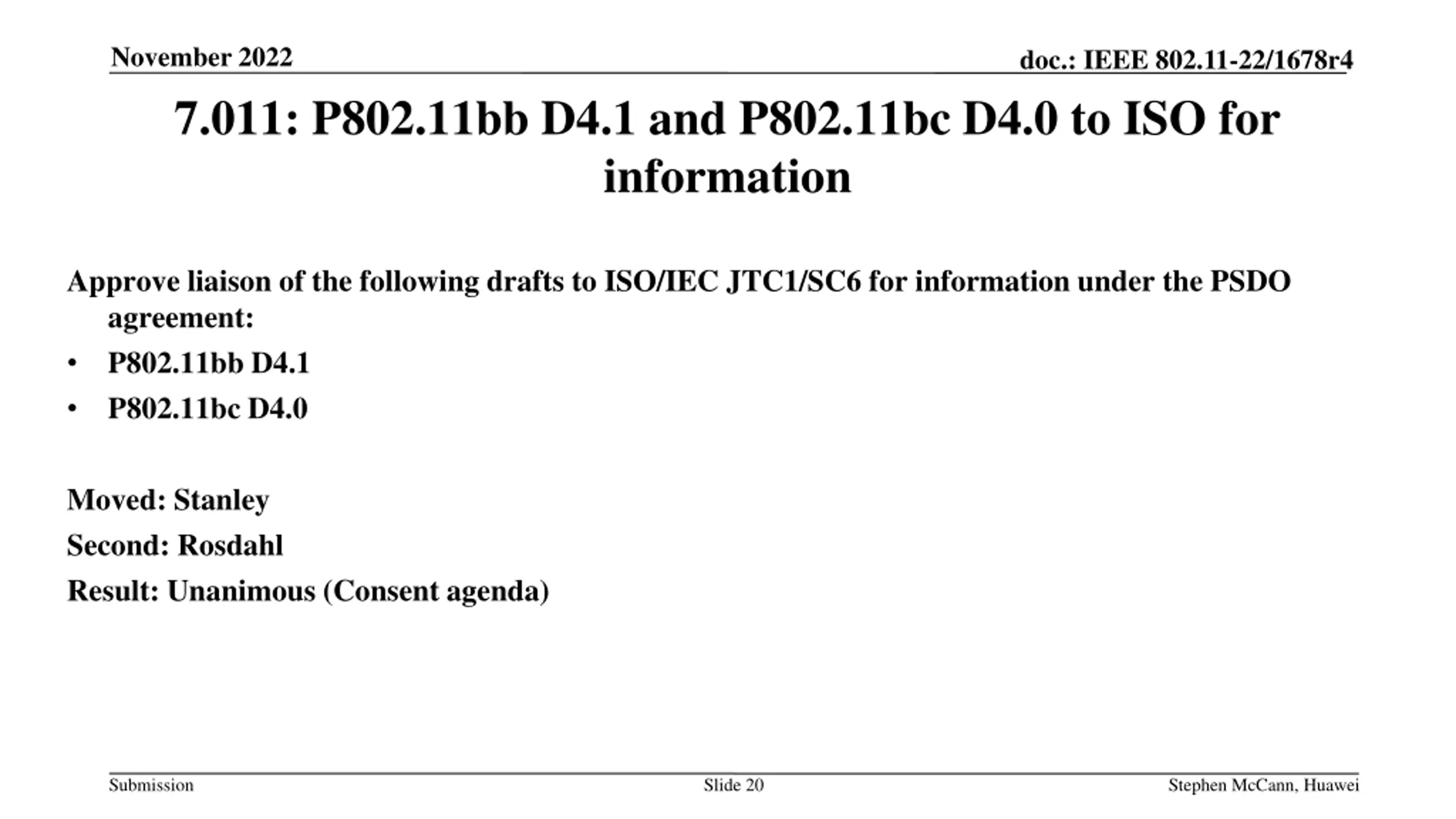 November 2022 doc.: IEEE 802.11-22/1678r4 7.011: P802.11bb D4.1 and P802.11bc D4.0 to ISO for information Approve liaison of the following drafts to ISO/IEC JTC1/SC6 for information under the PSDO agreement: P802.11bb D4.1 P802.11bc D4.0 Moved: Stanley Second: Rosdahl Result: Unanimous (Consent agenda) Submission Slide 20 Stephen McCann, Huawei