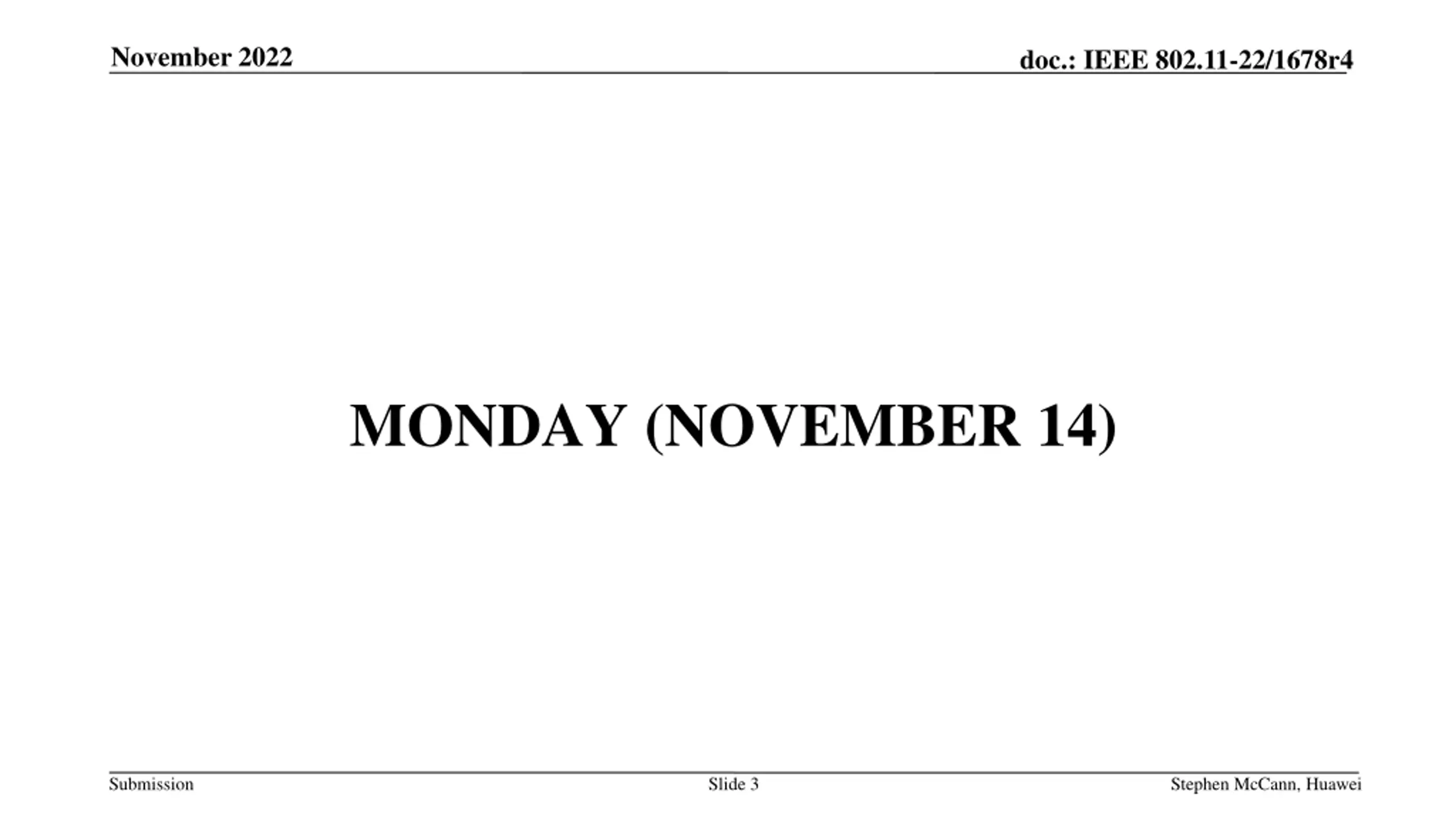 November 2022 doc.: IEEE 802.11-22/1678r4 MONDAY (NOVEMBER 14) Submission Slide 3 Stephen McCann, Huawei