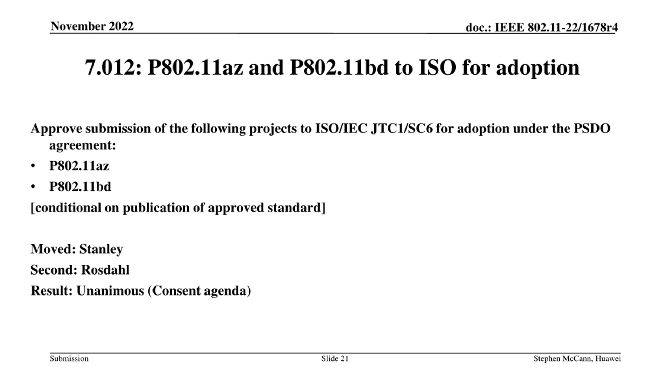 November 2022 doc.: IEEE 802.11-22/1678r4 7.012: P802.11az and P802.11bd to ISO for adoption Approve submission of the following projects to ISO/IEC JTC1/SC6 for adoption under the PSDO agreement: P802.11az P802.11bd [conditional on publication of approved standard] Moved: Stanley Second: Rosdahl Result: Unanimous (Consent agenda) Submission Slide 21 Stephen McCann, Huawei