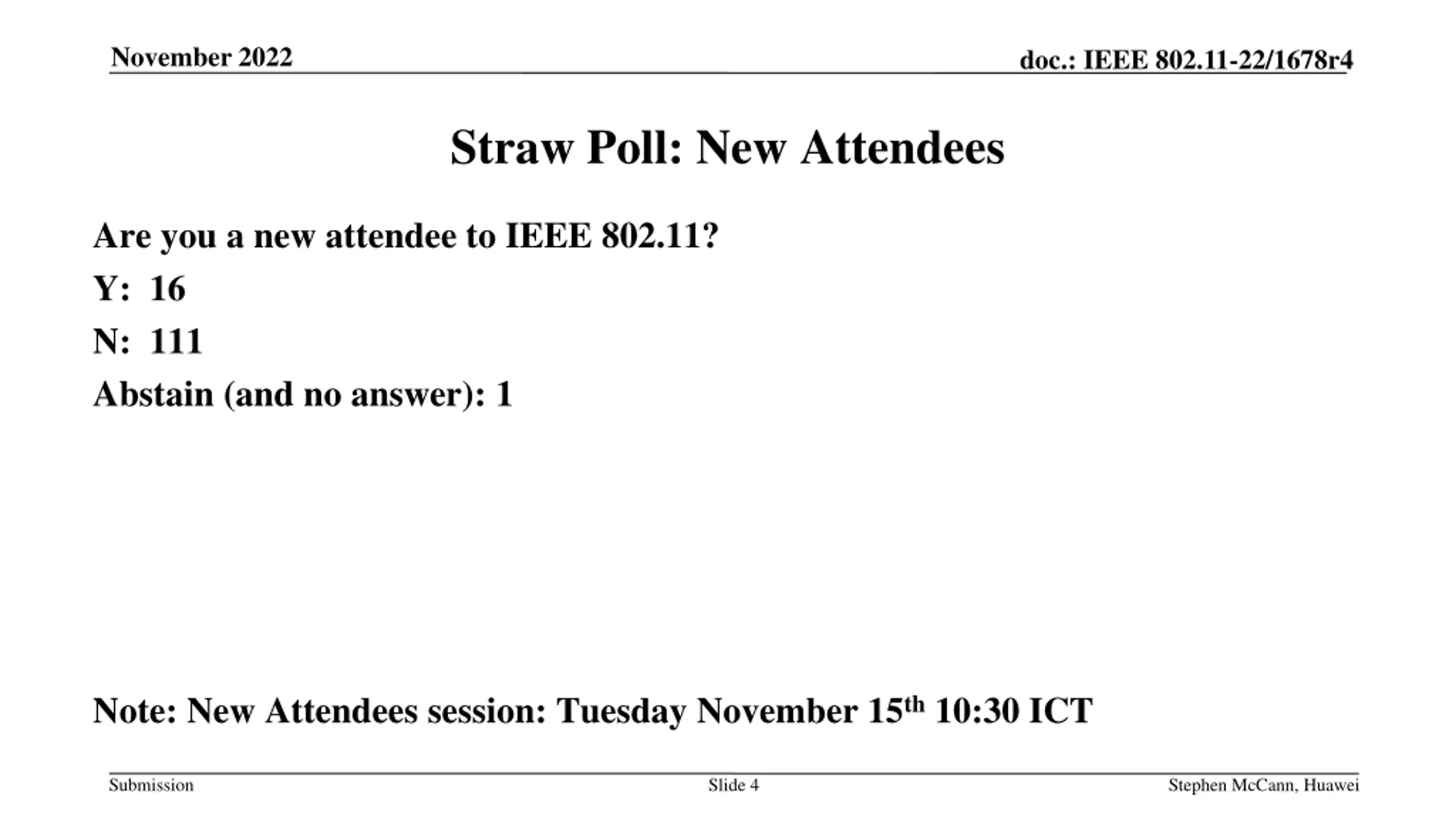 November 2022 doc.: IEEE 802.11-22/1678r4 Straw Poll: New Attendees Are you a new attendee to IEEE 802.11? Y: 16 N: 111 Abstain (and no answer): 1 Note: New Attendees session: Tuesday November 15th 10:30 ICT Submission Slide 4 Stephen McCann, Huawei