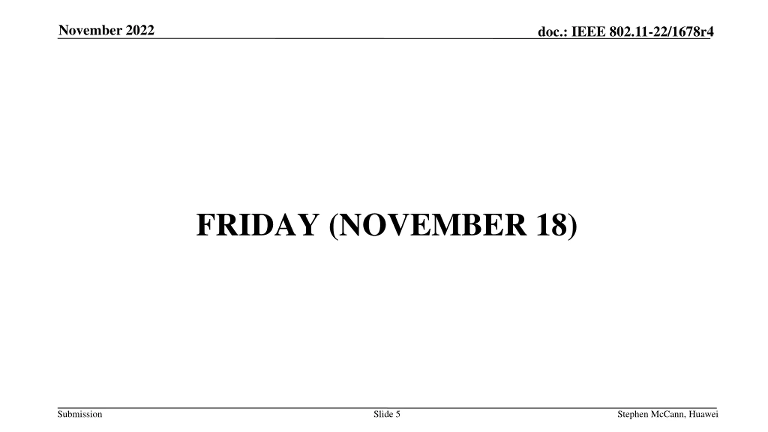 November 2022 doc.: IEEE 802.11-22/1678r4 FRIDAY (NOVEMBER 18) Submission Slide 5 Stephen McCann, Huawei