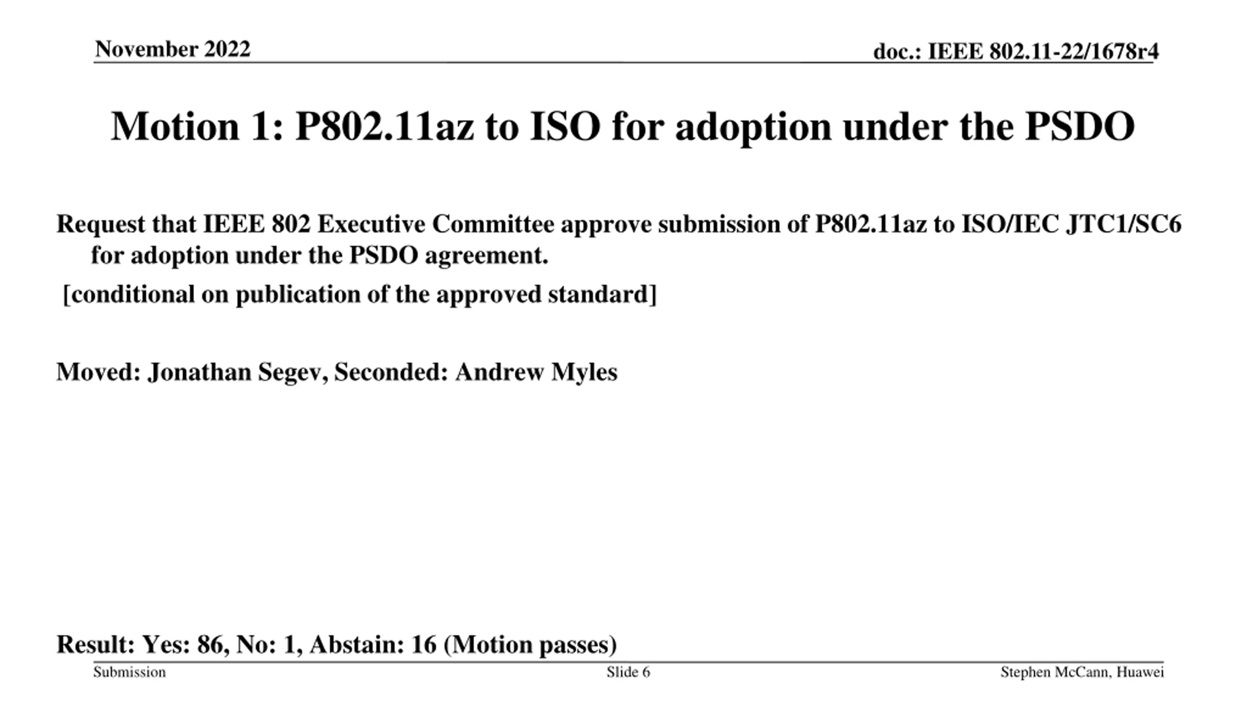 November 2022 doc.: IEEE 802.11-22/1678r4 Motion 1: P802.11az to ISO for adoption under the PSDO Request that IEEE 802 Executive Committee approve submission of P802.11az to ISO/IEC JTC1/SC6 for adoption under the PSDO agreement. [conditional on publication of the approved standard] Moved: Jonathan Segev, Seconded: Andrew Myles Result: Yes: 86, No: 1, Abstain: 16 (Motion passes) Submission Slide 6 Stephen McCann, Huawei
