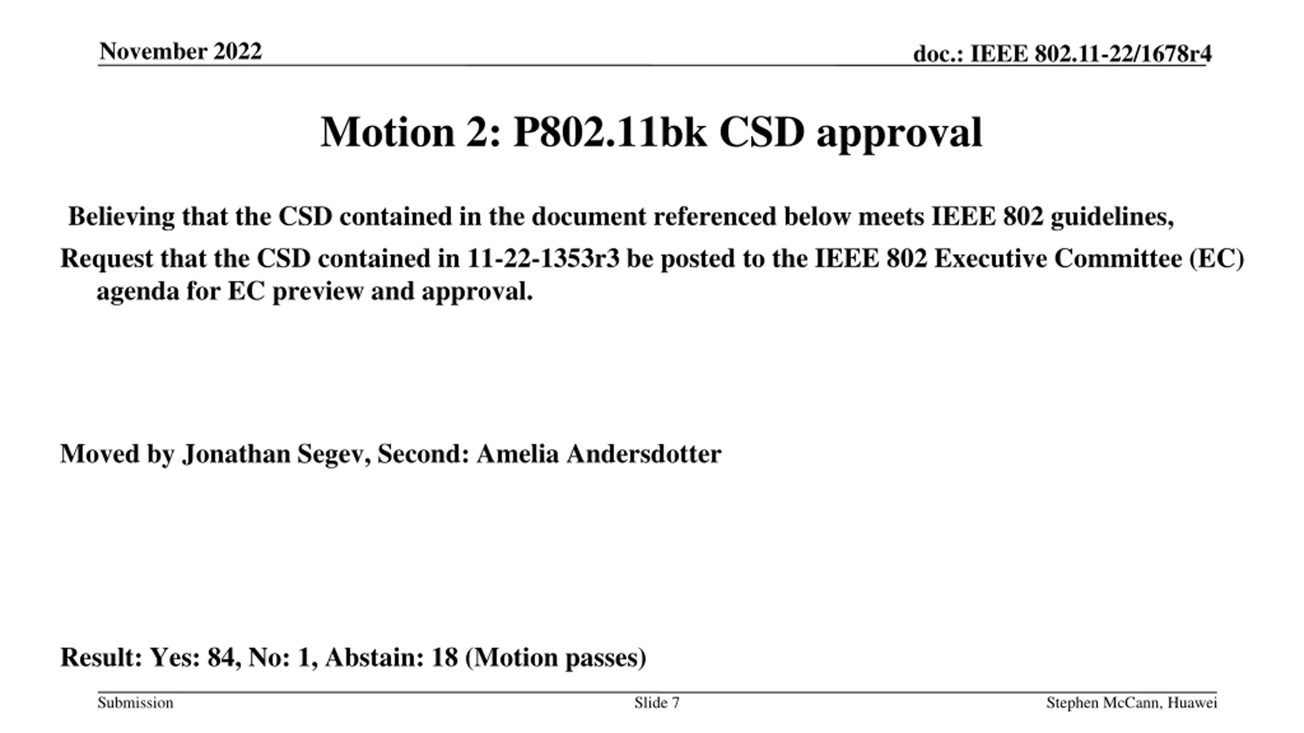 November 2022 doc.: IEEE 802.11-22/1678r4 Motion 2: P802.11bk CSD approval Believing that the CSD contained in the document referenced below meets IEEE 802 guidelines, Request that the CSD contained in 11-22-1353r3 be posted to the IEEE 802 Executive Committee (EC) agenda for EC preview and approval. Moved by Jonathan Segev, Second: Amelia Andersdotter Result: Yes: 84, No: 1, Abstain: 18 (Motion passes) Submission Slide 7 Stephen McCann, Huawei