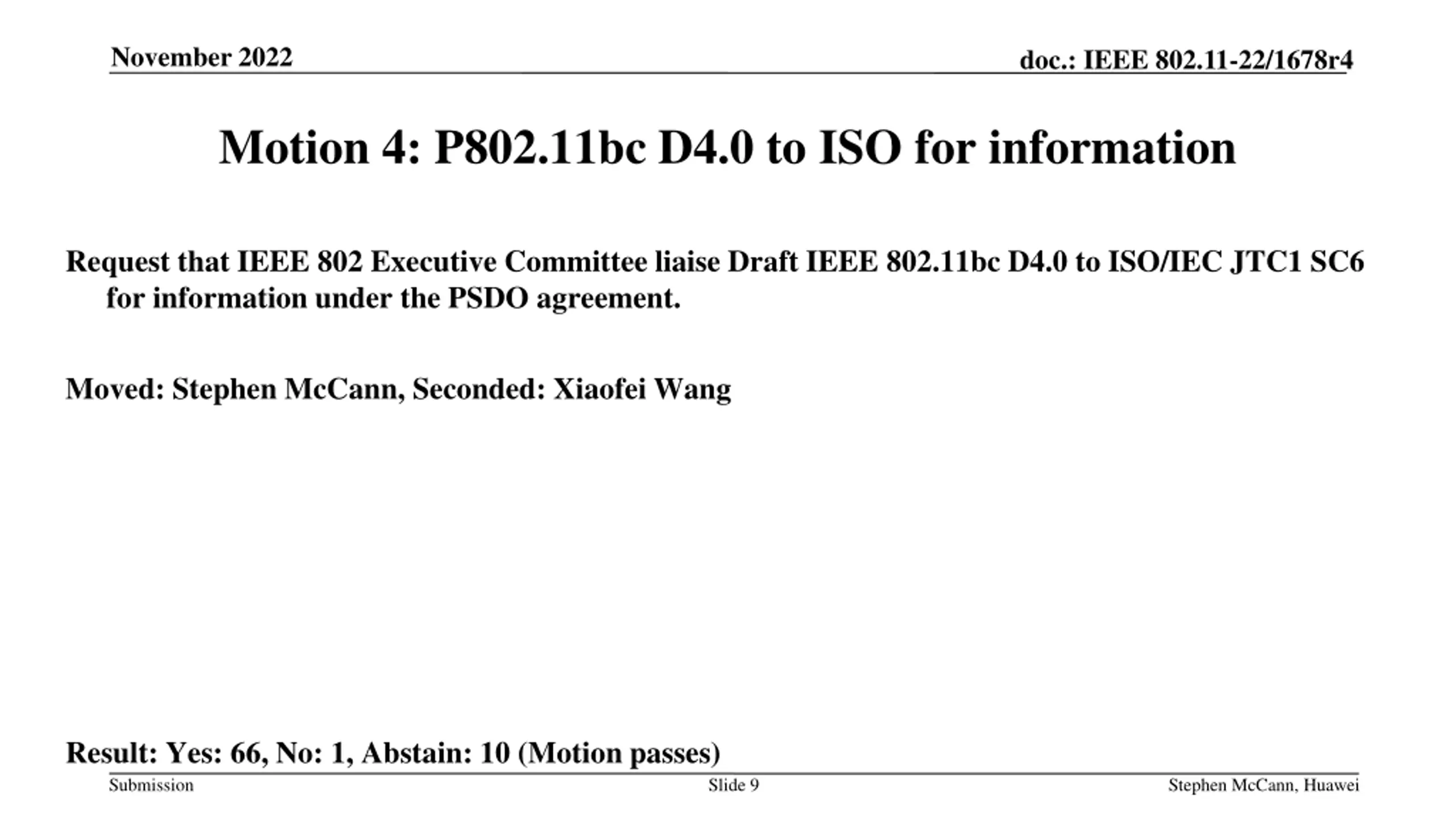 November 2022 doc.: IEEE 802.11-22/1678r4 Motion 4: P802.11bc D4.0 to ISO for information Request that IEEE 802 Executive Committee liaise Draft IEEE 802.11bc D4.0 to ISO/IEC JTC1 SC6 for information under the PSDO agreement. Moved: Stephen McCann, Seconded: Xiaofei Wang Result: Yes: 66, No: 1, Abstain: 10 (Motion passes) Submission Slide 9 Stephen McCann, Huawei