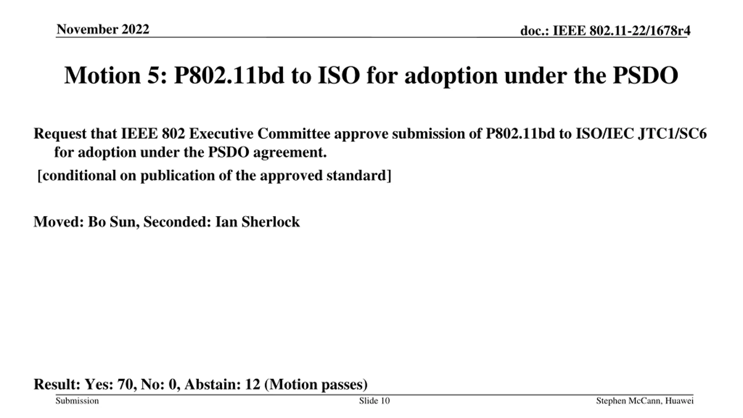 November 2022 doc.: IEEE 802.11-22/1678r4 Motion 5: P802.11bd to ISO for adoption under the PSDO Request that IEEE 802 Executive Committee approve submission of P802.11bd to ISO/IEC JTC1/SC6 for adoption under the PSDO agreement. [conditional on publication of the approved standard] Moved: Bo Sun, Seconded: Ian Sherlock Result: Yes: 70, No: 0, Abstain: 12 (Motion passes) Submission Slide 10 Stephen McCann, Huawei