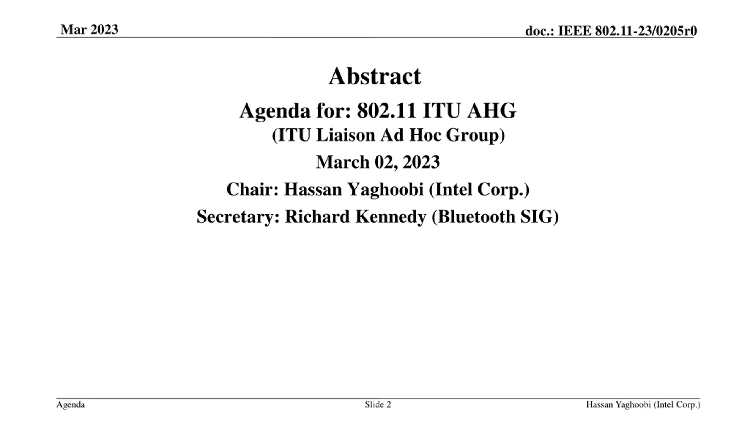 Mar 2023 doc.: IEEE 802.11-23/0205r0 Abstract Agenda for: 802.11 ITU AHG (ITU Liaison Ad Hoc Group) March 02, 2023 Chair: Hassan Yaghoobi (Intel Corp.) Secretary: Richard Kennedy (Bluetooth SIG) Agenda Slide 2 Hassan Yaghoobi (Intel Corp.)