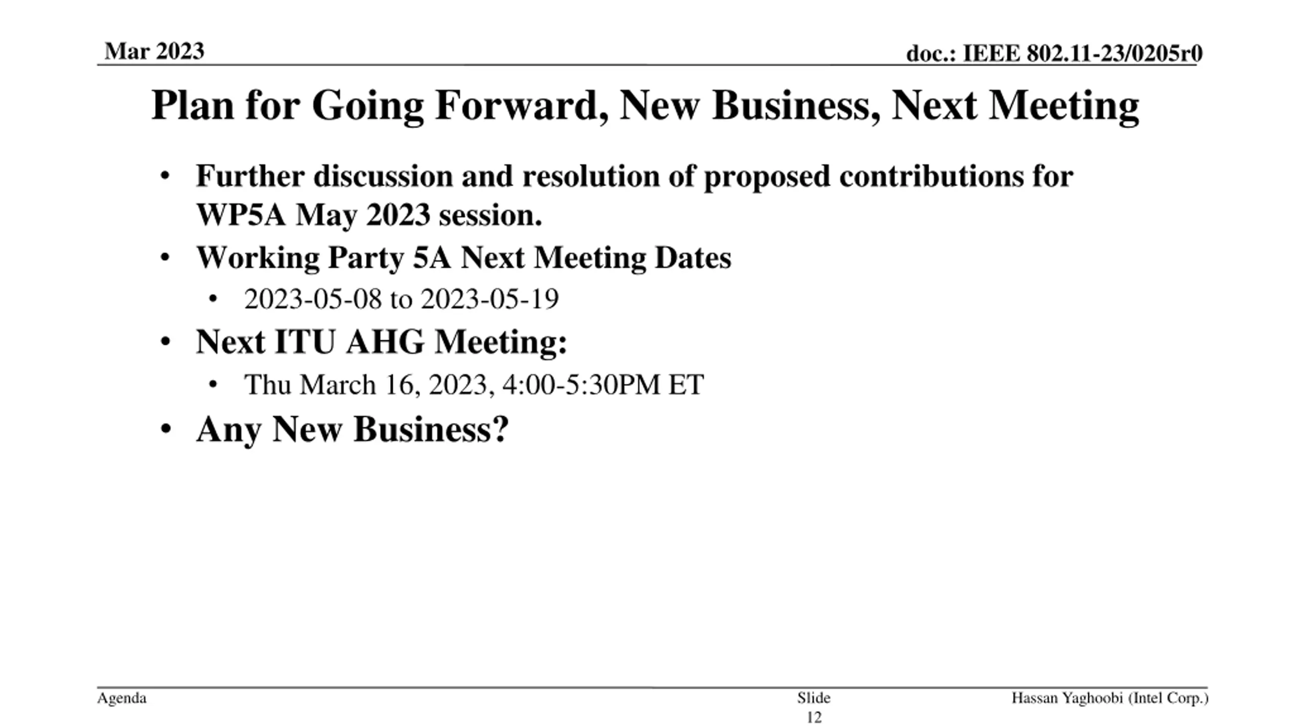 Mar 2023 doc.: IEEE 802.11-23/0205r0 Plan for Going Forward, New Business, Next Meeting Further discussion and resolution of proposed contributions for WP5A May 2023 session. Working Party 5A Next Meeting Dates 2023-05-08 to 2023-05-19 Next ITU AHG Meeting: Thu March 16, 2023, 4:00-5:30PM ET Any New Business? Agenda Slide 12 Hassan Yaghoobi (Intel Corp.)