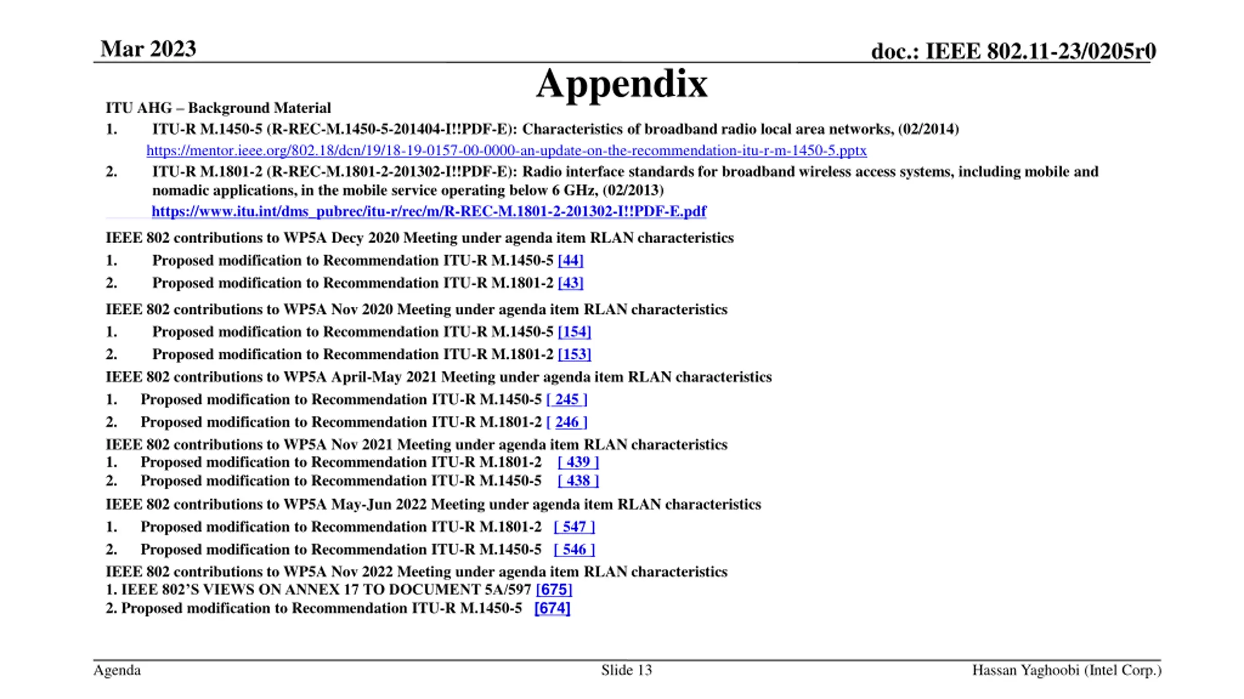 Mar 2023 doc.: IEEE 802.11-23/0205r0 Appendix ITU AHG Background Material 1. ITU-R M.1450-5 (R-REC-M.1450-5-201404-I!!PDF-E): Characteristics of broadband radio local area networks, (02/2014) https://mentor.ieee.org/802.18/dcn/19/18-19-0157-00-0000-an-update-on-the-recommendation-itu-r-m-1450-5.pptx 2. ITU-R M.1801-2 (R-REC-M.1801-2-201302-I!!PDF-E): Radio interface standards for broadband wireless access systems, including mobile and nomadic applications, in the mobile service operating below 6 GHz, (02/2013) https://www.itu.int/dms_pubrec/itu-r/rec/m/R-REC-M.1801-2-201302-I!!PDF-E.pdf IEEE 802 contributions to WP5A Decy 2020 Meeting under agenda item RLAN characteristics 1. Proposed modification to Recommendation ITU-R M.1450-5 [44] 2. Proposed modification to Recommendation ITU-R M.1801-2 [43] IEEE 802 contributions to WP5A Nov 2020 Meeting under agenda item RLAN characteristics 1. Proposed modification to Recommendation ITU-R M.1450-5 [154] 2. Proposed modification to Recommendation ITU-R M.1801-2 [153] IEEE 802 contributions to WP5A April-May 2021 Meeting under agenda item RLAN characteristics 1. Proposed modification to Recommendation ITU-R M.1450-5 [ 245 ] 2. Proposed modification to Recommendation ITU-R M.1801-2 [ 246 ] IEEE 802 contributions to WP5A Nov 2021 Meeting under agenda item RLAN characteristics 1. Proposed modification to Recommendation ITU-R M.1801-2 [ 439 ] 2. Proposed modification to Recommendation ITU-R M.1450-5 [ 438 ] IEEE 802 contributions to WP5A May-Jun 2022 Meeting under agenda item RLAN characteristics 1. Proposed modification to Recommendation ITU-R M.1801-2 [ 547 ] 2. Proposed modification to Recommendation ITU-R M.1450-5 [ 546 ] IEEE 802 contributions to WP5A Nov 2022 Meeting under agenda item RLAN characteristics 1. IEEE 802 S VIEWS ON ANNEX 17 TO DOCUMENT 5A/597[675] 2. Proposed modification to Recommendation ITU-R M.1450-5 [674] Agenda Slide 13 Hassan Yaghoobi (Intel Corp.)