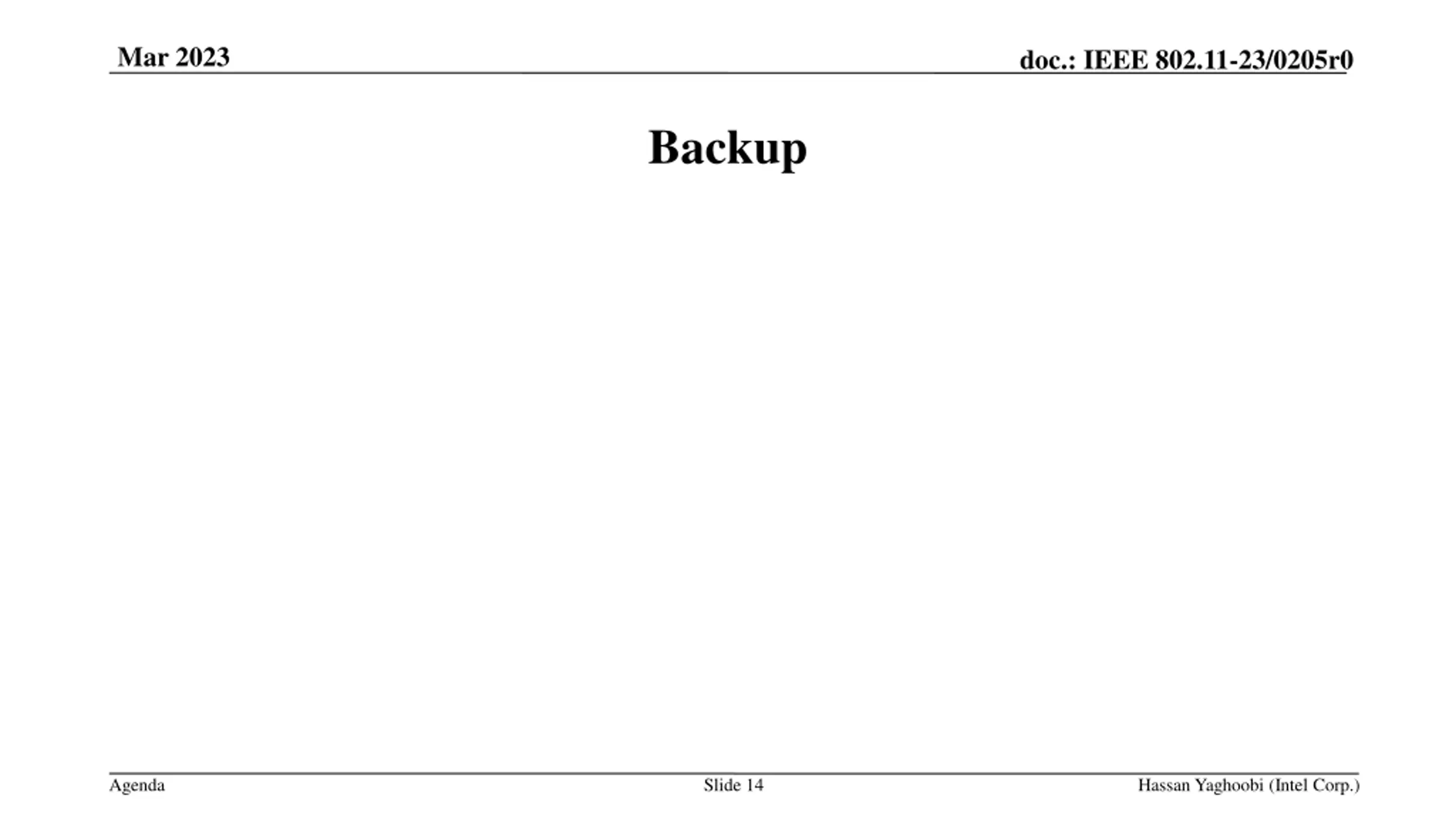 Mar 2023 doc.: IEEE 802.11-23/0205r0 Backup Agenda Slide 14 Hassan Yaghoobi (Intel Corp.)