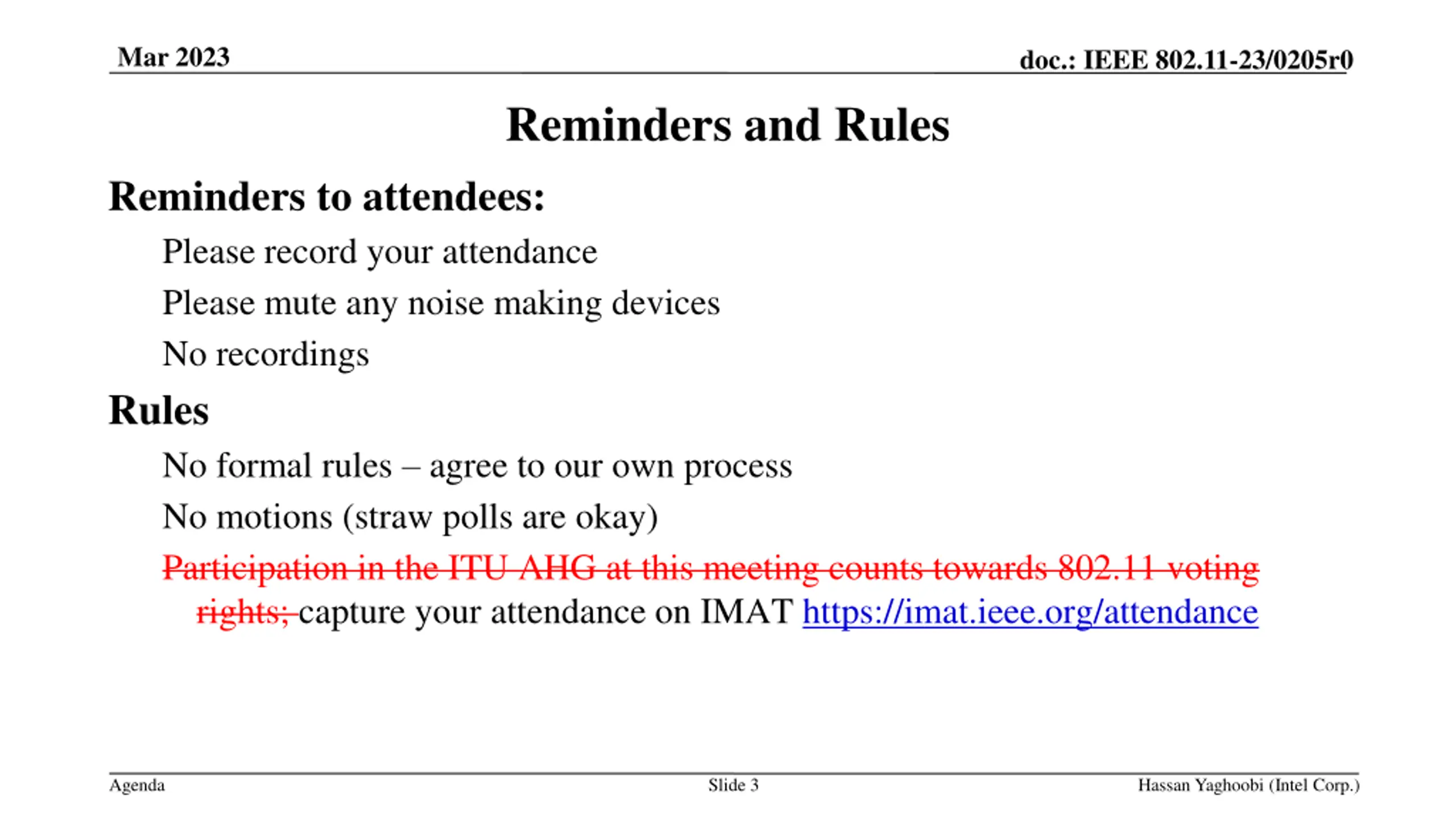 Mar 2023 doc.: IEEE 802.11-23/0205r0 Reminders and Rules Reminders to attendees: Please record your attendance Please mute any noise making devices No recordings Rules No formal rules agree to our own process No motions (straw polls are okay) Participation in the ITU AHG at this meeting counts towards 802.11 voting rights; capture your attendance on IMAT https://imat.ieee.org/attendance Agenda Slide 3 Hassan Yaghoobi (Intel Corp.)