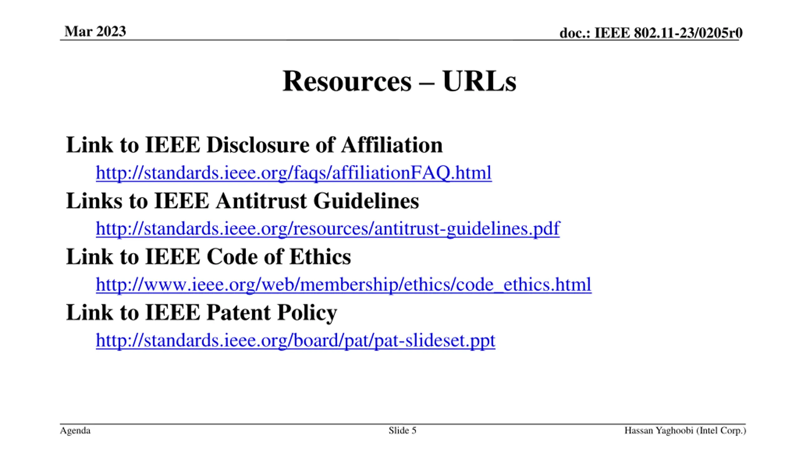 Mar 2023 doc.: IEEE 802.11-23/0205r0 Resources URLs Link to IEEE Disclosure of Affiliation http://standards.ieee.org/faqs/affiliationFAQ.html Links to IEEE Antitrust Guidelines http://standards.ieee.org/resources/antitrust-guidelines.pdf Link to IEEE Code of Ethics http://www.ieee.org/web/membership/ethics/code_ethics.html Link to IEEE Patent Policy http://standards.ieee.org/board/pat/pat-slideset.ppt Agenda Slide 5 Hassan Yaghoobi (Intel Corp.)