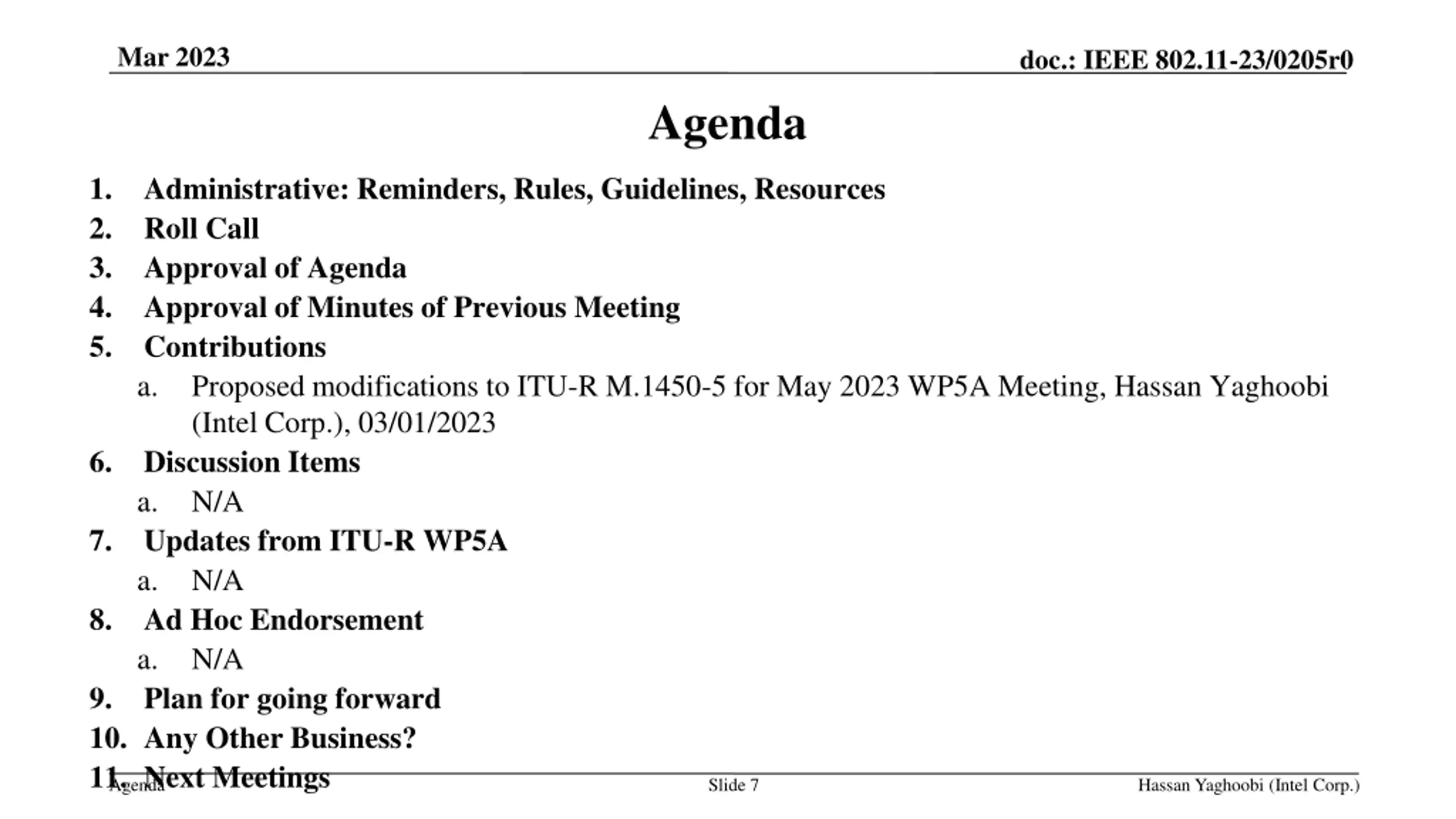 Mar 2023 doc.: IEEE 802.11-23/0205r0 Agenda 1. 2. 3. 4. 5. Administrative: Reminders, Rules, Guidelines, Resources Roll Call Approval of Agenda Approval of Minutes of Previous Meeting Contributions a. Proposed modifications to ITU-R M.1450-5 for May 2023 WP5A Meeting, Hassan Yaghoobi (Intel Corp.), 03/01/2023 Discussion Items a. N/A Updates from ITU-R WP5A a. N/A Ad Hoc Endorsement a. N/A Plan for going forward 10. Any Other Business? 6. 7. 8. 9. Agenda 11. Next Meetings Slide 7 Hassan Yaghoobi (Intel Corp.)