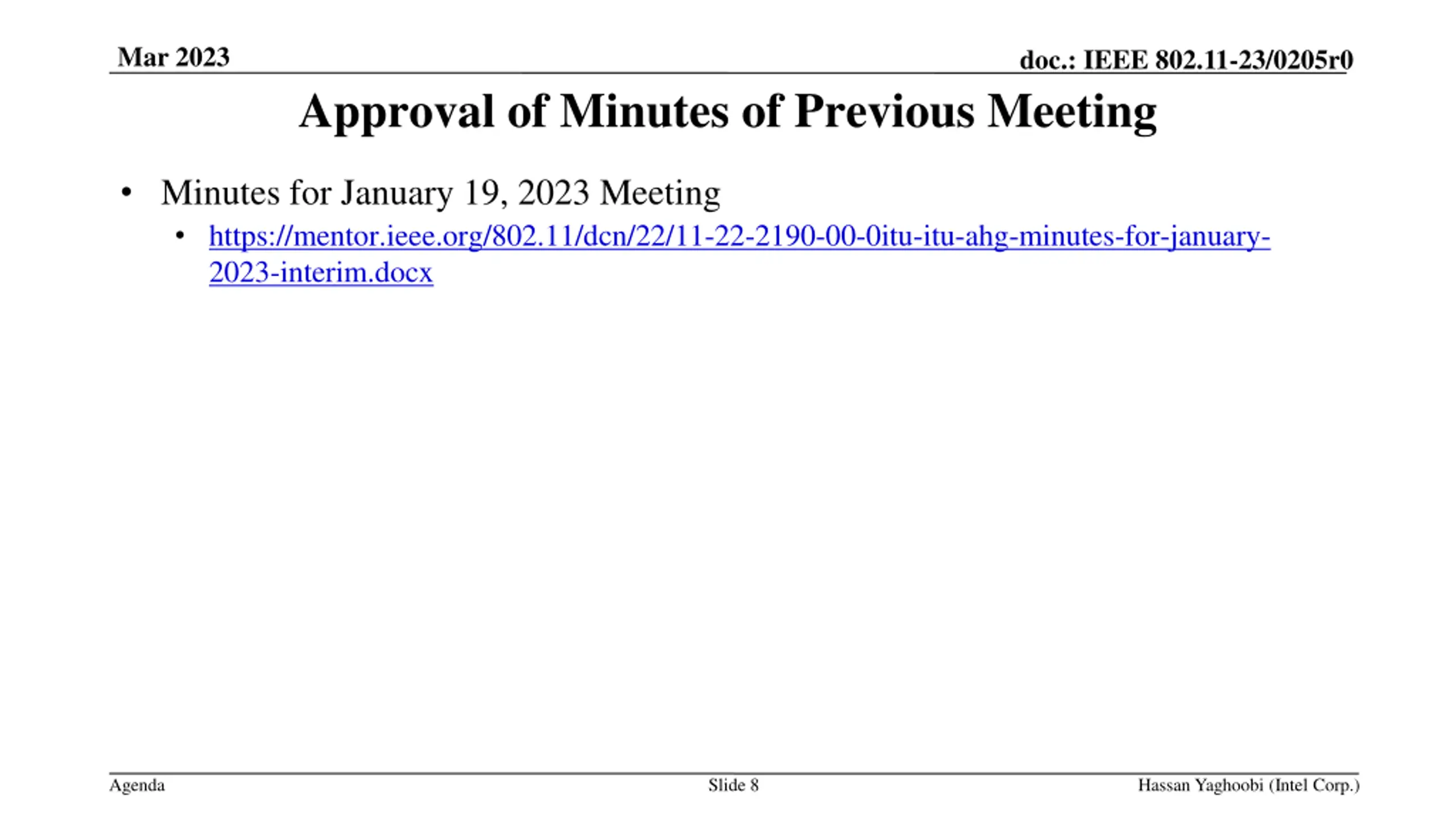 Mar 2023 doc.: IEEE 802.11-23/0205r0 Approval of Minutes of Previous Meeting Minutes for January 19, 2023 Meeting https://mentor.ieee.org/802.11/dcn/22/11-22-2190-00-0itu-itu-ahg-minutes-for-january- 2023-interim.docx Agenda Slide 8 Hassan Yaghoobi (Intel Corp.)