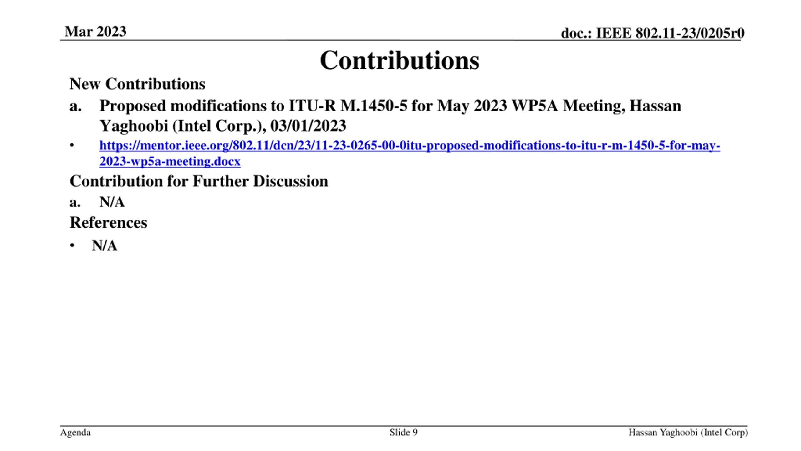 Mar 2023 doc.: IEEE 802.11-23/0205r0 Contributions New Contributions a. Proposed modifications to ITU-R M.1450-5 for May 2023 WP5A Meeting, Hassan Yaghoobi (Intel Corp.), 03/01/2023 https://mentor.ieee.org/802.11/dcn/23/11-23-0265-00-0itu-proposed-modifications-to-itu-r-m-1450-5-for-may- 2023-wp5a-meeting.docx Contribution for Further Discussion a. N/A References N/A Agenda Slide 9 Hassan Yaghoobi (Intel Corp)