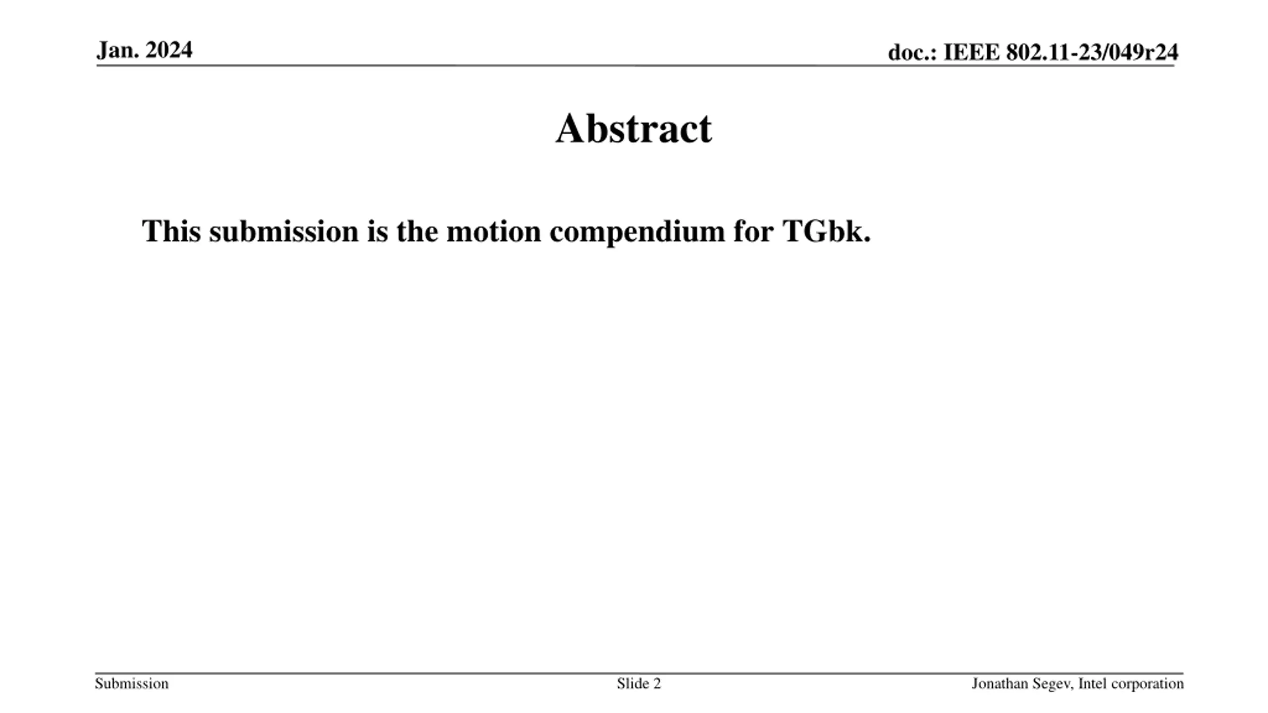 Jan. 2024 doc.: IEEE 802.11-23/049r24 Abstract This submission is the motion compendium for TGbk. Submission Slide 2 Jonathan Segev, Intel corporation