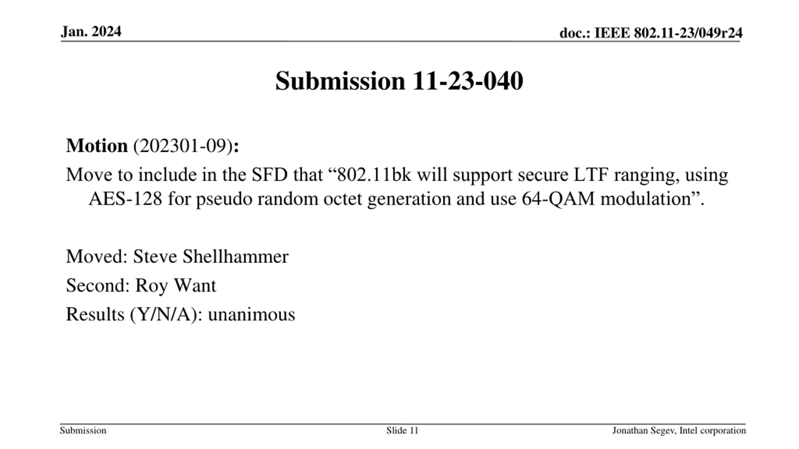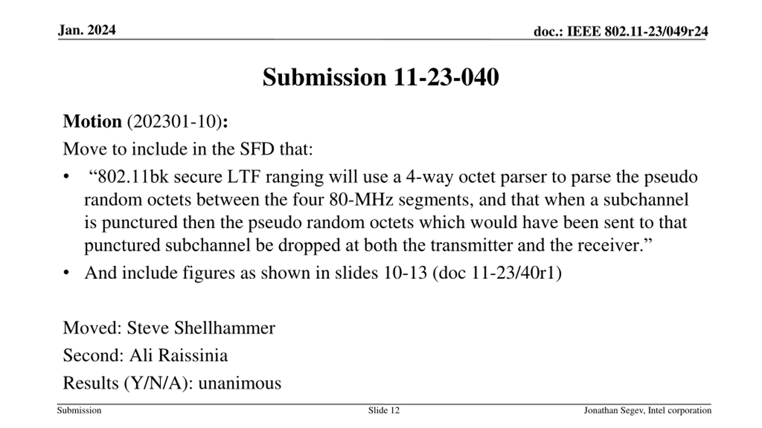Jan. 2024 doc.: IEEE 802.11-23/049r24 Submission 11-23-040 Motion (202301-09): Move to include in the SFD that 802.11bk will support secure LTF ranging, using AES-128 for pseudo random octet generation and use 64-QAM modulation . Moved: Steve Shellhammer Second: Roy Want Results (Y/N/A): unanimous Submission Slide 11 Jonathan Segev, Intel corporation