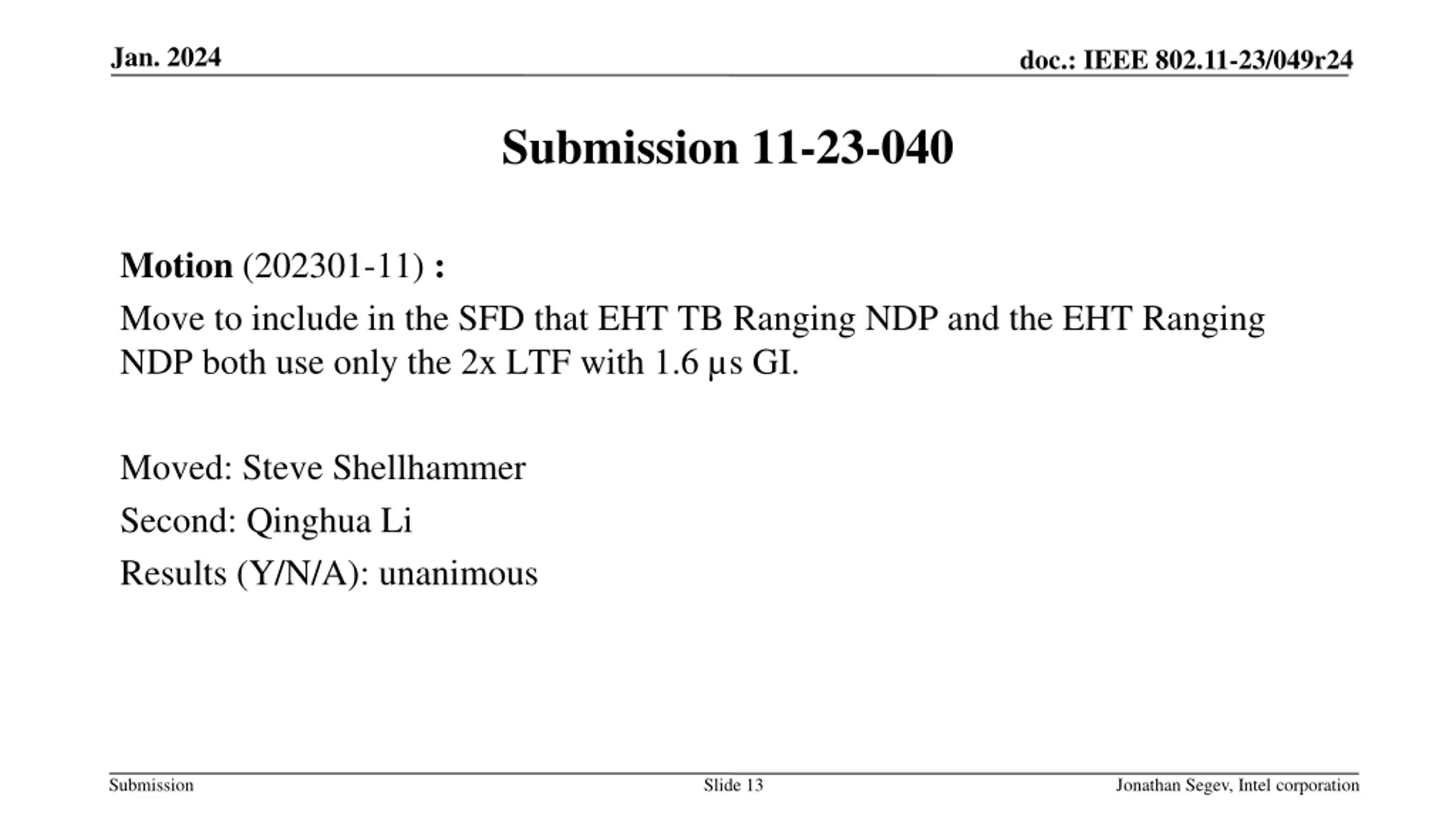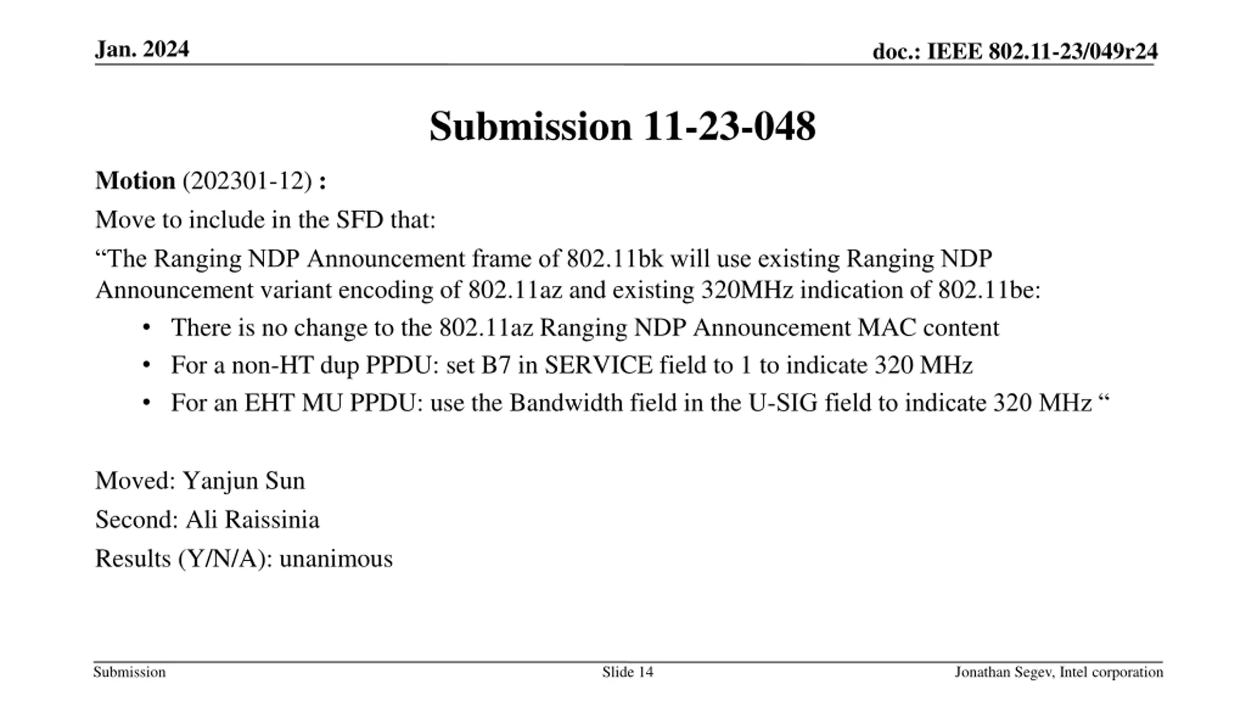 Jan. 2024 doc.: IEEE 802.11-23/049r24 Submission 11-23-040 Motion (202301-11) : Move to include in the SFD that EHT TB Ranging NDP and the EHT Ranging NDP both use only the 2x LTF with 1.6 s GI. Moved: Steve Shellhammer Second: Qinghua Li Results (Y/N/A): unanimous Submission Slide 13 Jonathan Segev, Intel corporation