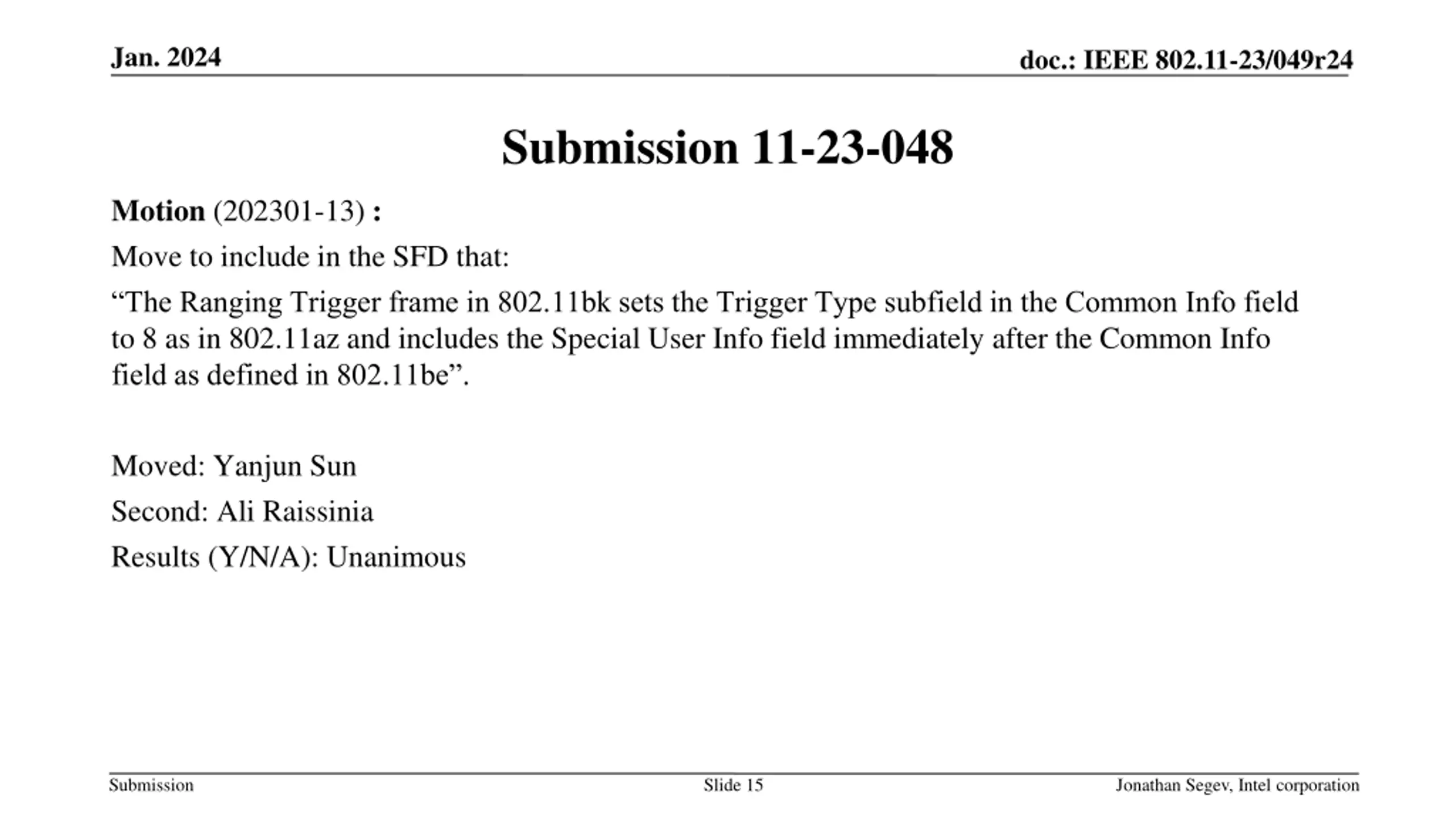 Jan. 2024 doc.: IEEE 802.11-23/049r24 Submission 11-23-048 Motion (202301-13) : Move to include in the SFD that: The Ranging Trigger frame in 802.11bk sets the Trigger Type subfield in the Common Info field to 8 as in 802.11az and includes the Special User Info field immediately after the Common Info field as defined in 802.11be . Moved: Yanjun Sun Second: Ali Raissinia Results (Y/N/A): Unanimous Submission Slide 15 Jonathan Segev, Intel corporation