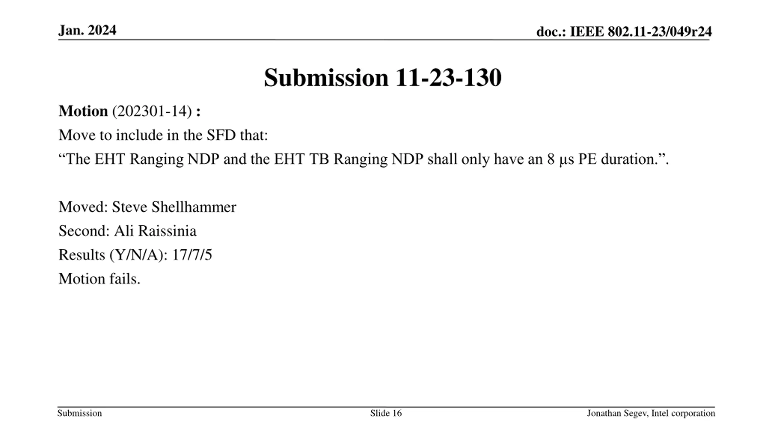 Jan. 2024 doc.: IEEE 802.11-23/049r24 Submission 11-23-130 Motion (202301-14) : Move to include in the SFD that: The EHT Ranging NDP and the EHT TB Ranging NDP shall only have an 8 s PE duration. . Moved: Steve Shellhammer Second: Ali Raissinia Results (Y/N/A): 17/7/5 Motion fails. Submission Slide 16 Jonathan Segev, Intel corporation