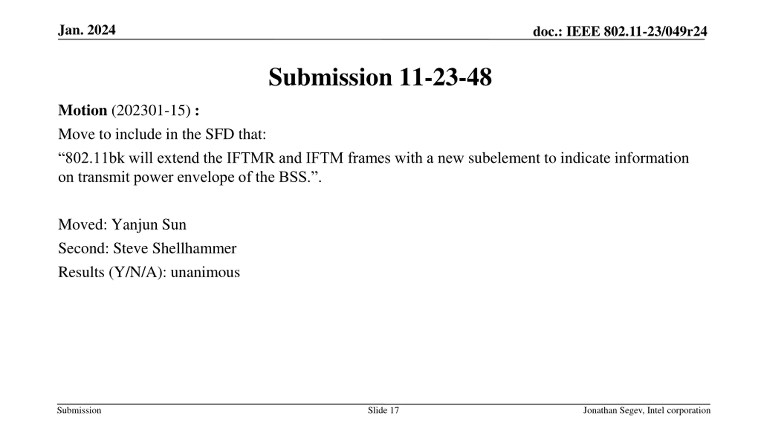Jan. 2024 doc.: IEEE 802.11-23/049r24 Submission 11-23-48 Motion (202301-15) : Move to include in the SFD that: 802.11bk will extend the IFTMR and IFTM frames with a new subelement to indicate information on transmit power envelope of the BSS. . Moved: Yanjun Sun Second: Steve Shellhammer Results (Y/N/A): unanimous Submission Slide 17 Jonathan Segev, Intel corporation