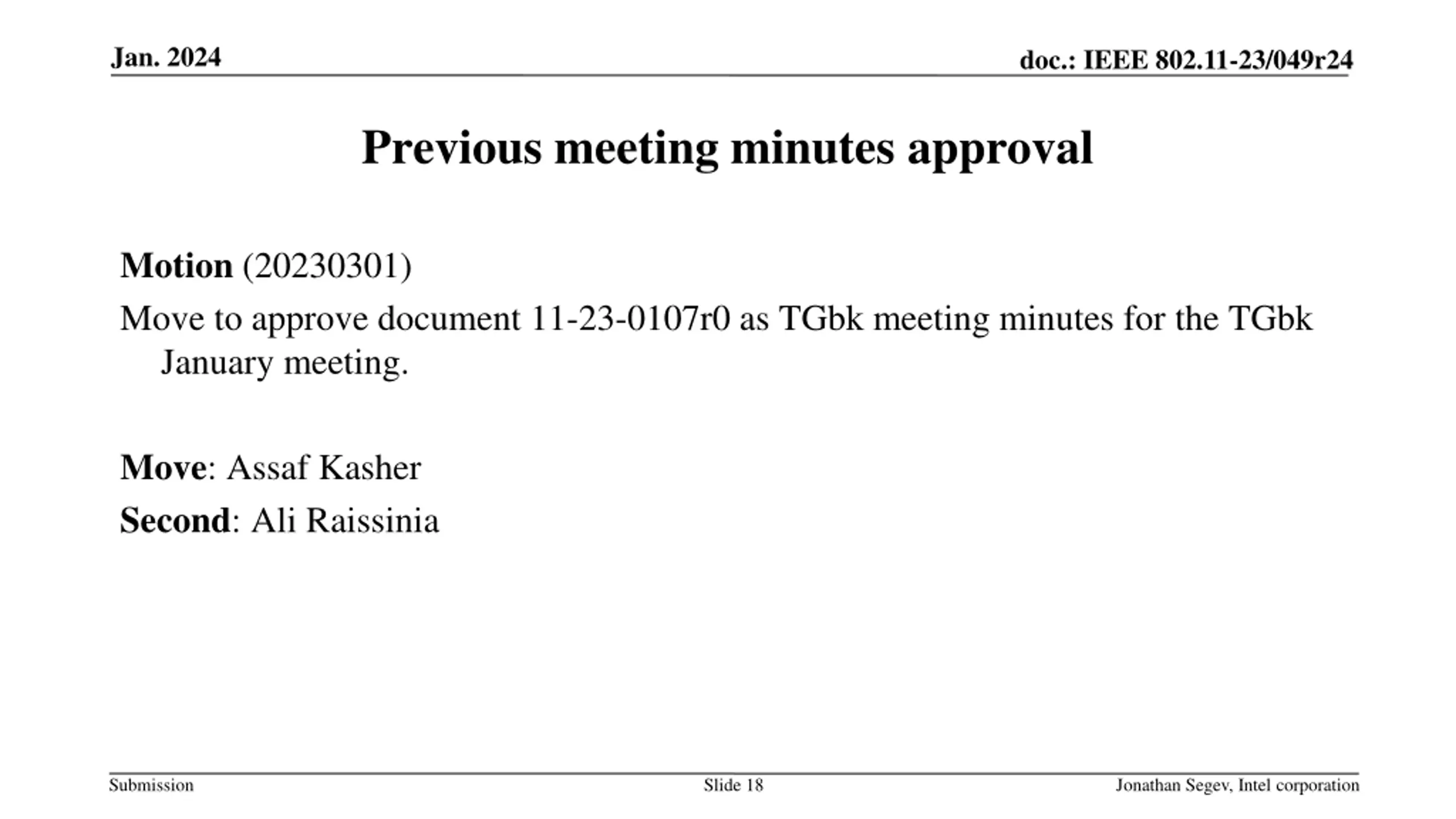 Jan. 2024 doc.: IEEE 802.11-23/049r24 Previous meeting minutes approval Motion (20230301) Move to approve document 11-23-0107r0 as TGbk meeting minutes for the TGbk January meeting. Move: Assaf Kasher Second: Ali Raissinia Submission Slide 18 Jonathan Segev, Intel corporation