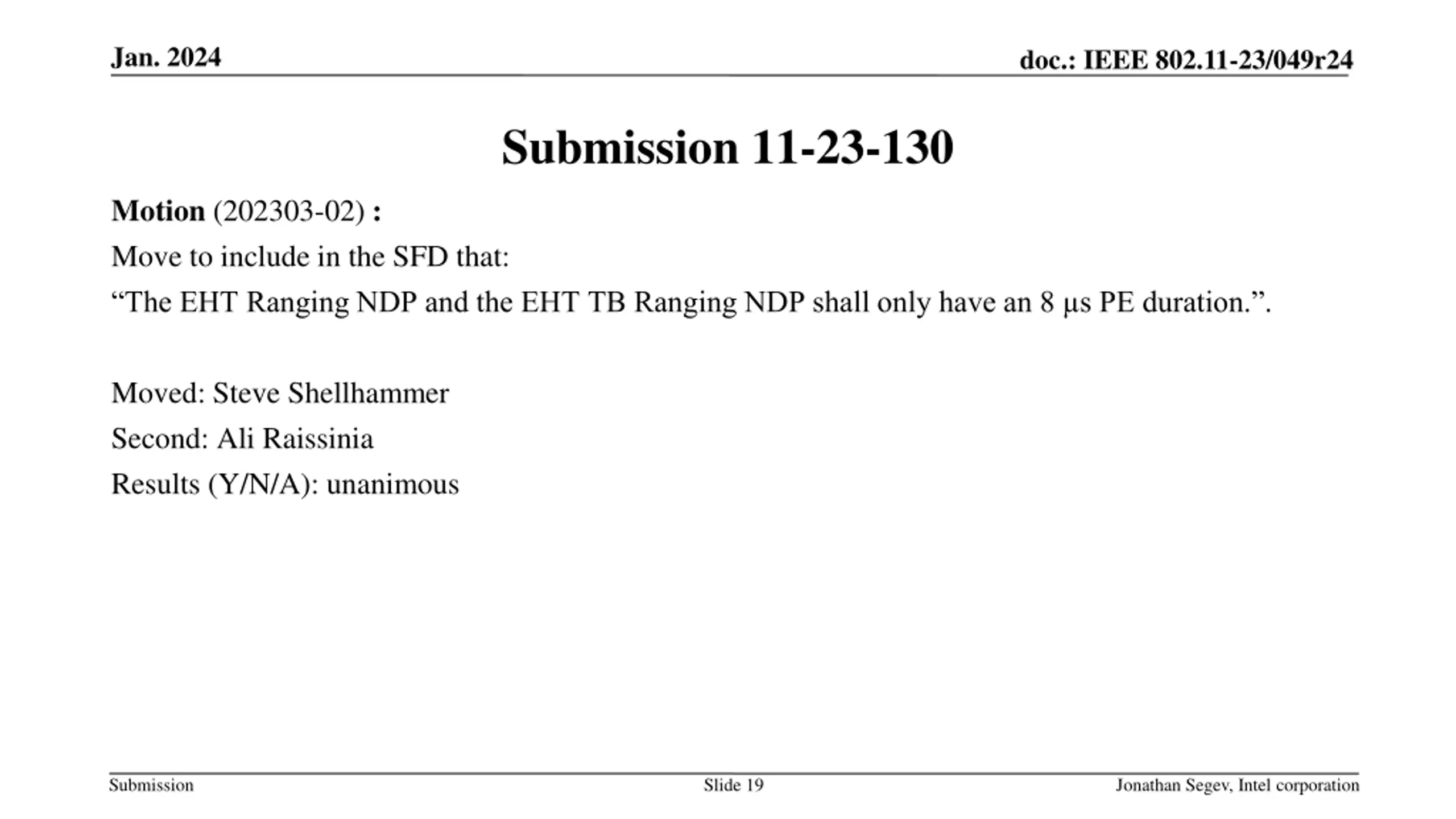 Jan. 2024 doc.: IEEE 802.11-23/049r24 Submission 11-23-130 Motion (202303-02) : Move to include in the SFD that: The EHT Ranging NDP and the EHT TB Ranging NDP shall only have an 8 s PE duration. . Moved: Steve Shellhammer Second: Ali Raissinia Results (Y/N/A): unanimous Submission Slide 19 Jonathan Segev, Intel corporation