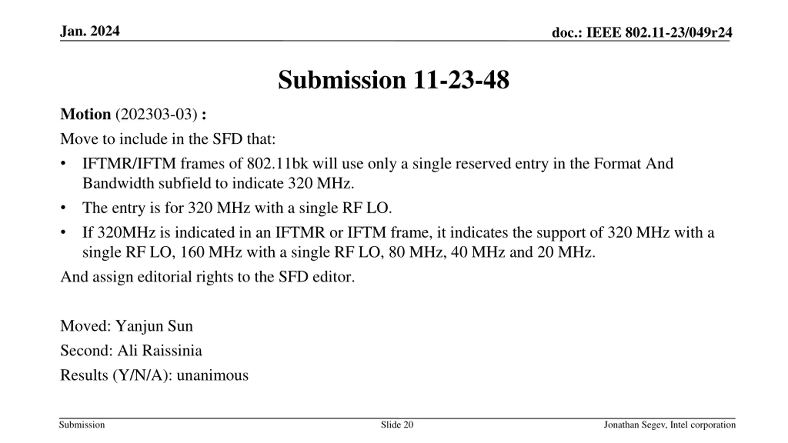 Jan. 2024 doc.: IEEE 802.11-23/049r24 Submission 11-23-48 Motion (202303-03) : Move to include in the SFD that: IFTMR/IFTM frames of 802.11bk will use only a single reserved entry in the Format And Bandwidth subfield to indicate 320 MHz. The entry is for 320 MHz with a single RF LO. If 320MHz is indicated in an IFTMR or IFTM frame, it indicates the support of 320 MHz with a single RF LO, 160 MHz with a single RF LO, 80 MHz, 40 MHz and 20 MHz. And assign editorial rights to the SFD editor. Moved: Yanjun Sun Second: Ali Raissinia Results (Y/N/A): unanimous Submission Slide 20 Jonathan Segev, Intel corporation