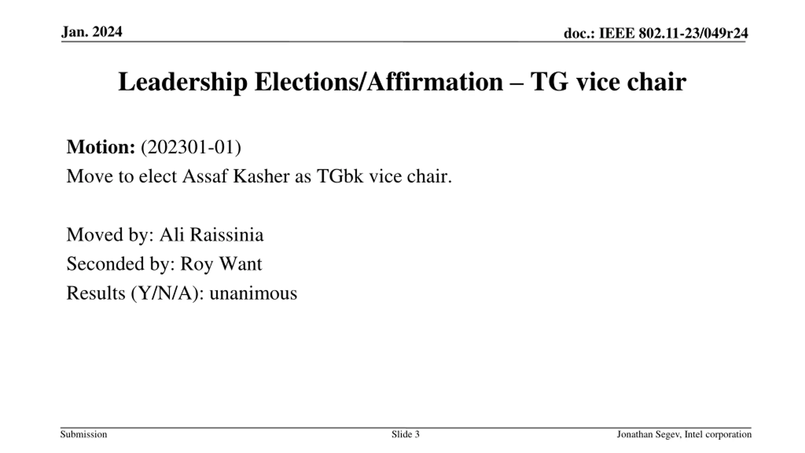 Jan. 2024 doc.: IEEE 802.11-23/049r24 Leadership Elections/Affirmation TG vice chair Motion: (202301-01) Move to elect Assaf Kasher as TGbk vice chair. Moved by: Ali Raissinia Seconded by: Roy Want Results (Y/N/A): unanimous Submission Slide 3 Jonathan Segev, Intel corporation