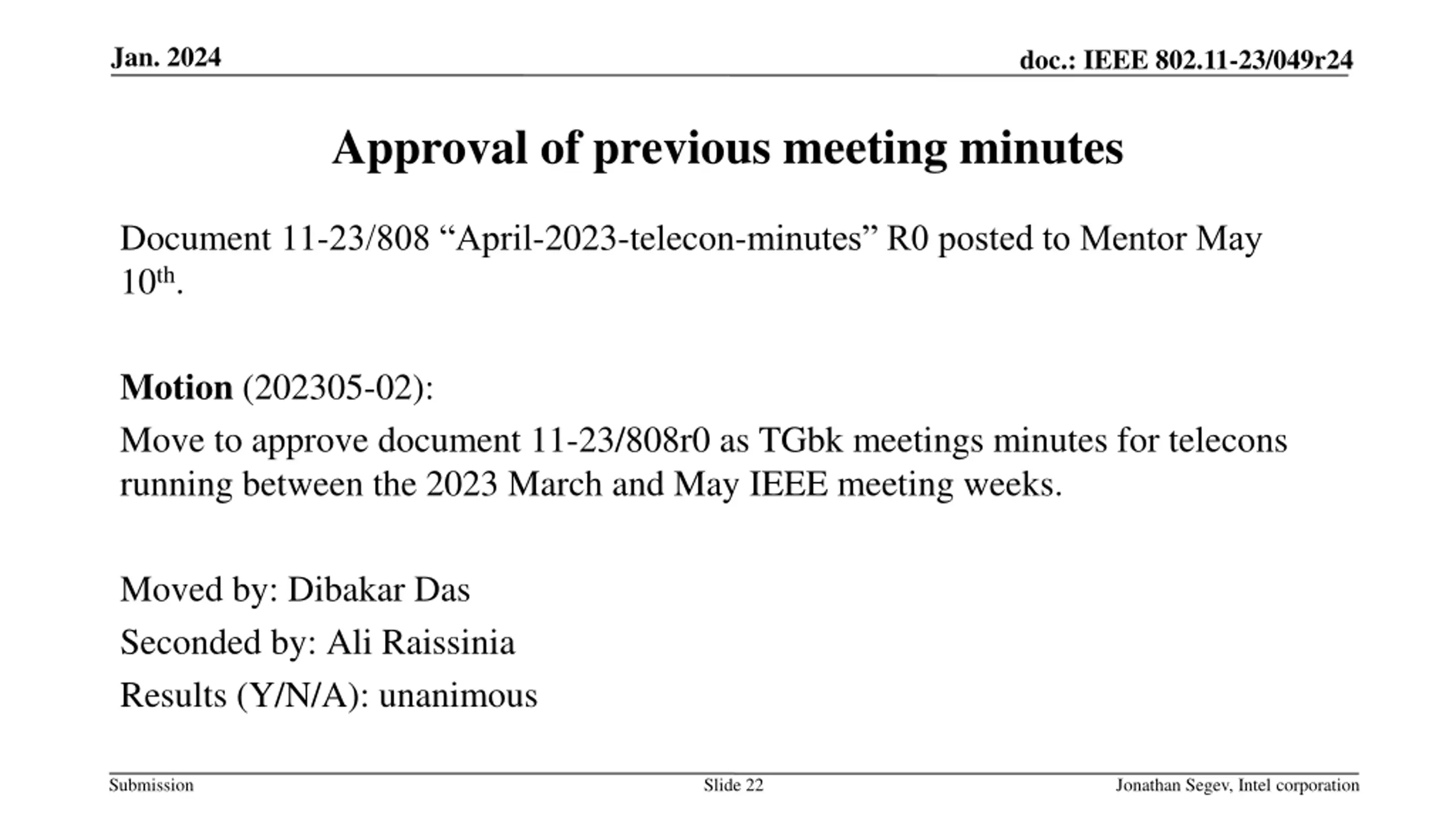 Jan. 2024 doc.: IEEE 802.11-23/049r24 Approval of previous meeting minutes Document 11-23/418 March-2023-plenary-minutes R0 posted to Mentor March 30th . Motion (202305-01): Move to approve document 11-23/418r0 as TGbk meeting minutes for the 2023 March IEEE meeting week. Moved by: Assaf Kasher Seconded by: James Gilb Results (Y/N/A): unanimous Submission Slide 21 Jonathan Segev, Intel corporation