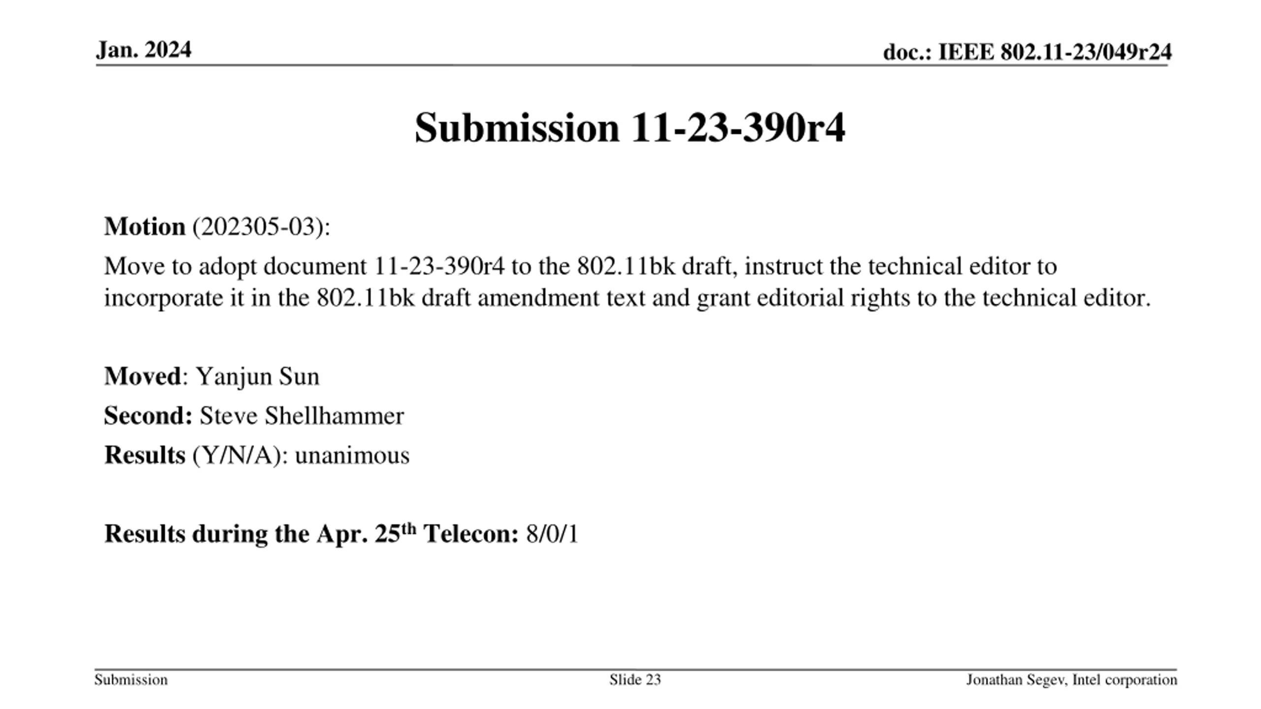 Jan. 2024 doc.: IEEE 802.11-23/049r24 Submission 11-23-390r4 Motion (202305-03): Move to adopt document 11-23-390r4 to the 802.11bk draft, instruct the technical editor to incorporate it in the 802.11bk draft amendment text and grant editorial rights to the technical editor. Moved: Yanjun Sun Second: Steve Shellhammer Results (Y/N/A): unanimous Results during the Apr. 25th Telecon: 8/0/1 Submission Slide 23 Jonathan Segev, Intel corporation