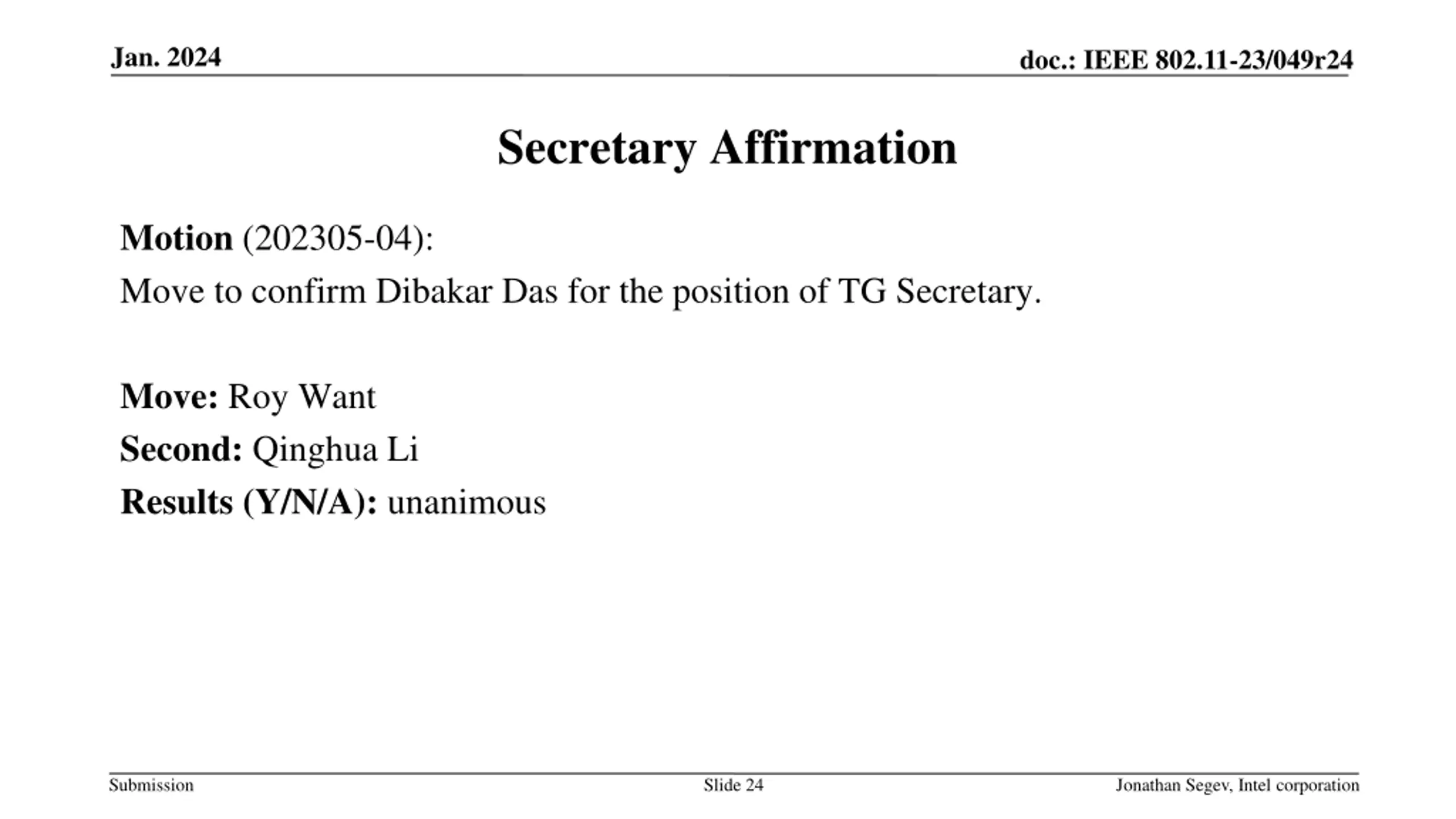 Jan. 2024 doc.: IEEE 802.11-23/049r24 Secretary Affirmation Motion (202305-04): Move to confirm Dibakar Das for the position of TG Secretary. Move: Roy Want Second: Qinghua Li Results (Y/N/A): unanimous Submission Slide 24 Jonathan Segev, Intel corporation