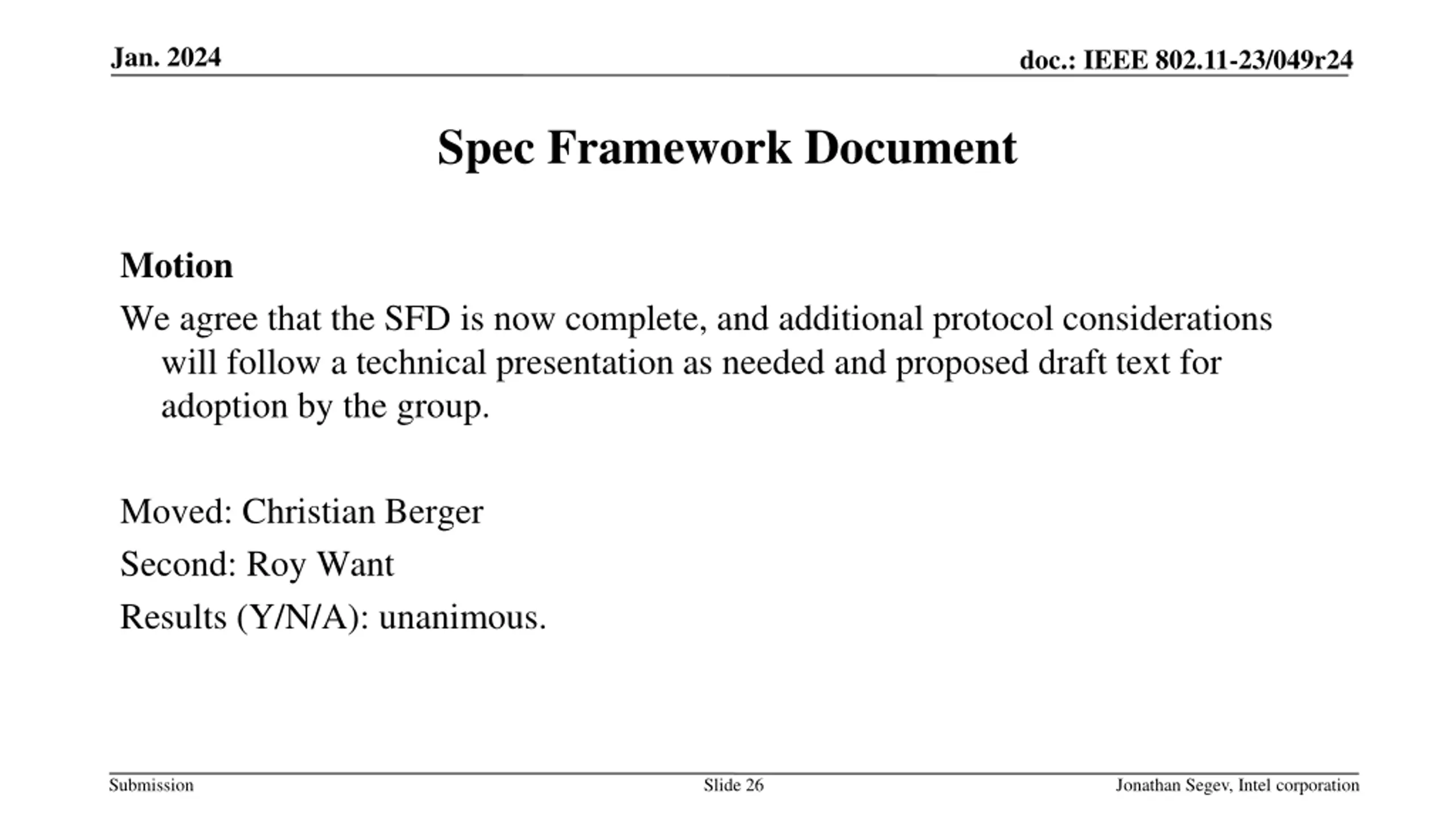 Jan. 2024 doc.: IEEE 802.11-23/049r24 Spec Framework Document Motion We agree that the SFD is now complete, and additional protocol considerations will follow a technical presentation as needed and proposed draft text for adoption by the group. Moved: Christian Berger Second: Roy Want Results (Y/N/A): unanimous. Submission Slide 26 Jonathan Segev, Intel corporation