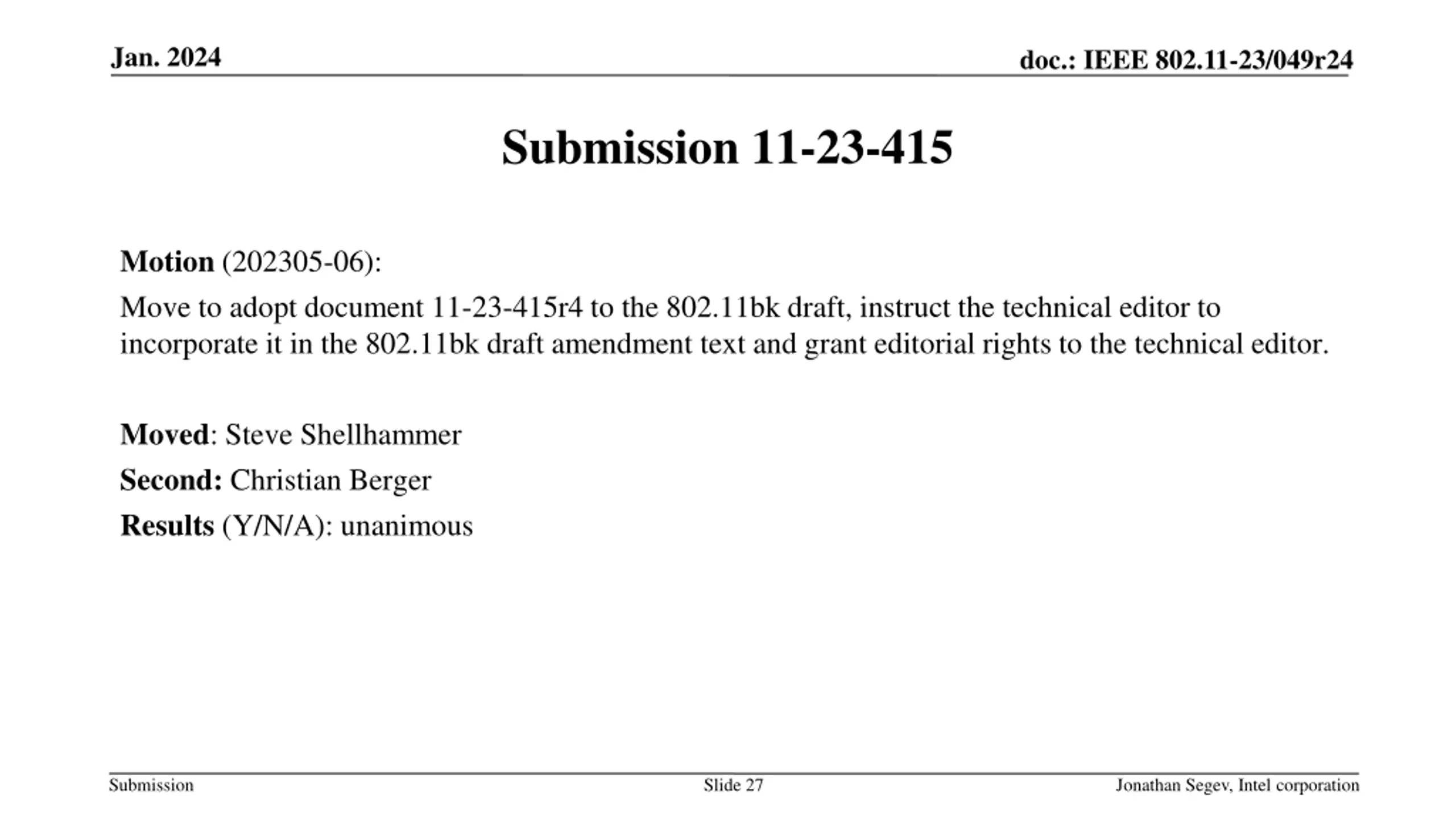 Jan. 2024 doc.: IEEE 802.11-23/049r24 Submission 11-23-415 Motion (202305-06): Move to adopt document 11-23-415r4 to the 802.11bk draft, instruct the technical editor to incorporate it in the 802.11bk draft amendment text and grant editorial rights to the technical editor. Moved: Steve Shellhammer Second: Christian Berger Results (Y/N/A): unanimous Submission Slide 27 Jonathan Segev, Intel corporation