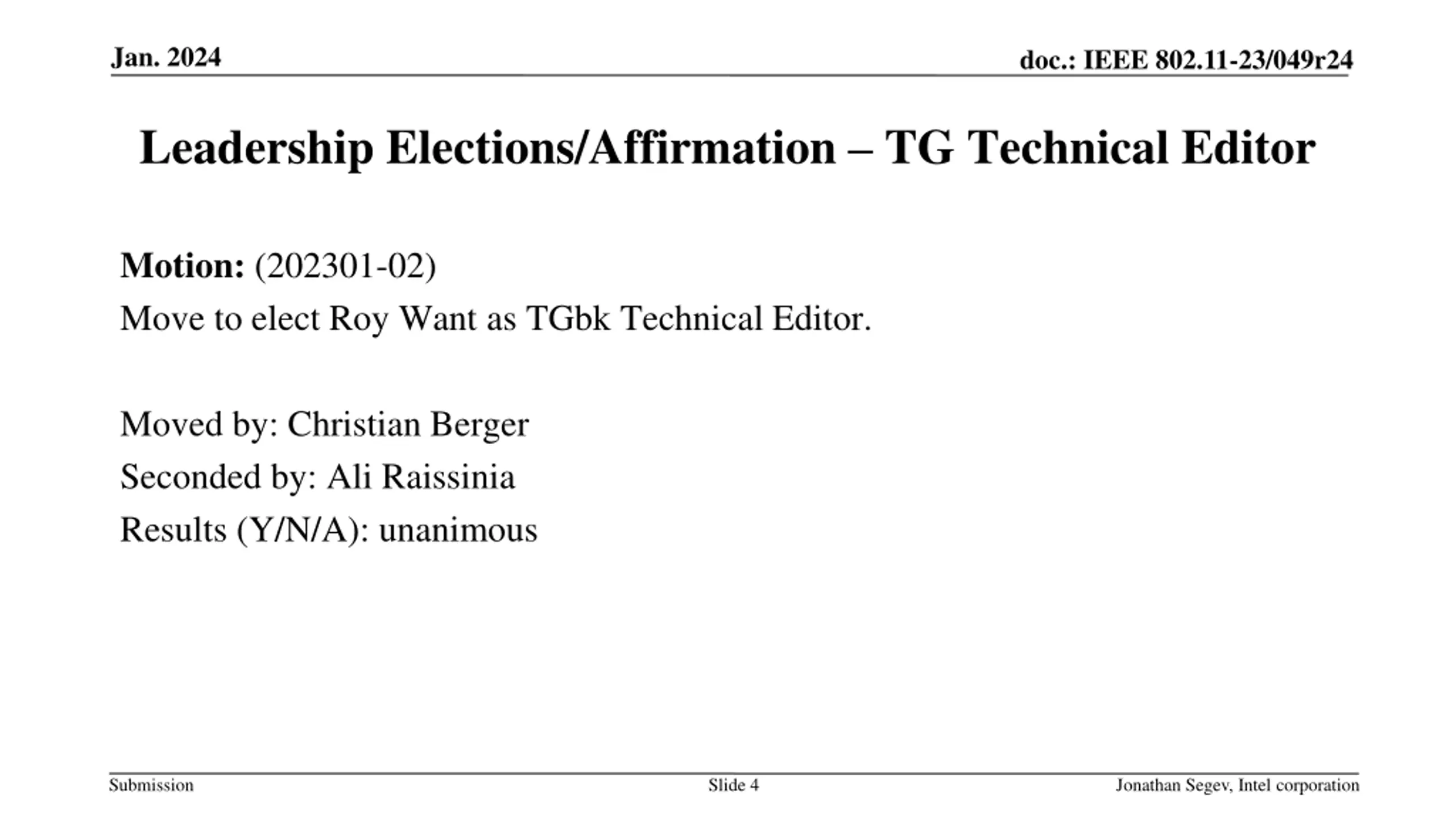 Jan. 2024 doc.: IEEE 802.11-23/049r24 Leadership Elections/Affirmation TG Technical Editor Motion: (202301-02) Move to elect Roy Want as TGbk Technical Editor. Moved by: Christian Berger Seconded by: Ali Raissinia Results (Y/N/A): unanimous Submission Slide 4 Jonathan Segev, Intel corporation