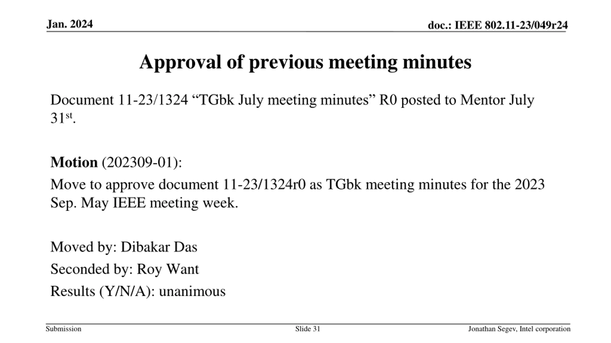Jan. 2024 doc.: IEEE 802.11-23/049r24 Approval of previous meeting minutes Document 11-23/1324 TGbk July meeting minutes R0 posted to Mentor July 31st. Motion (202309-01): Move to approve document 11-23/1324r0 as TGbk meeting minutes for the 2023 Sep. May IEEE meeting week. Moved by: Dibakar Das Seconded by: Roy Want Results (Y/N/A): unanimous Submission Slide 31 Jonathan Segev, Intel corporation
