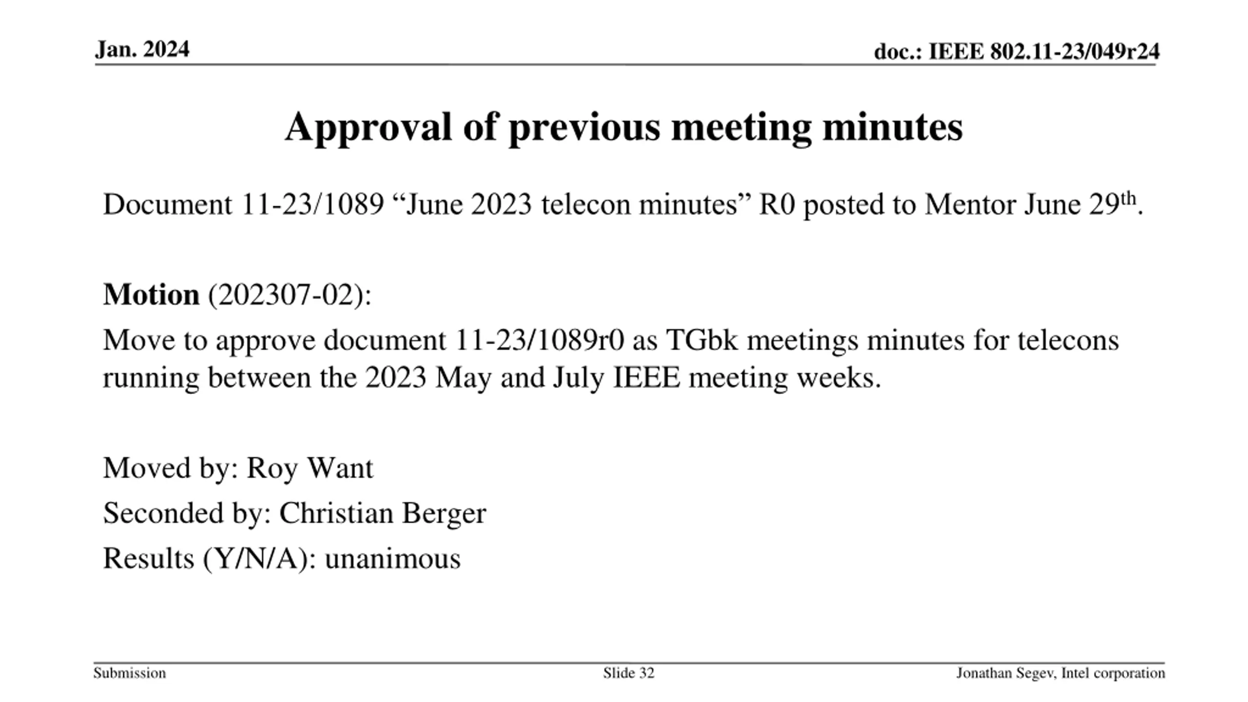 Jan. 2024 doc.: IEEE 802.11-23/049r24 Approval of previous meeting minutes Document 11-23/1089 June 2023 telecon minutes R0 posted to Mentor June 29th. Motion (202307-02): Move to approve document 11-23/1089r0 as TGbk meetings minutes for telecons running between the 2023 May and July IEEE meeting weeks. Moved by: Roy Want Seconded by: Christian Berger Results (Y/N/A): unanimous Submission Slide 32 Jonathan Segev, Intel corporation