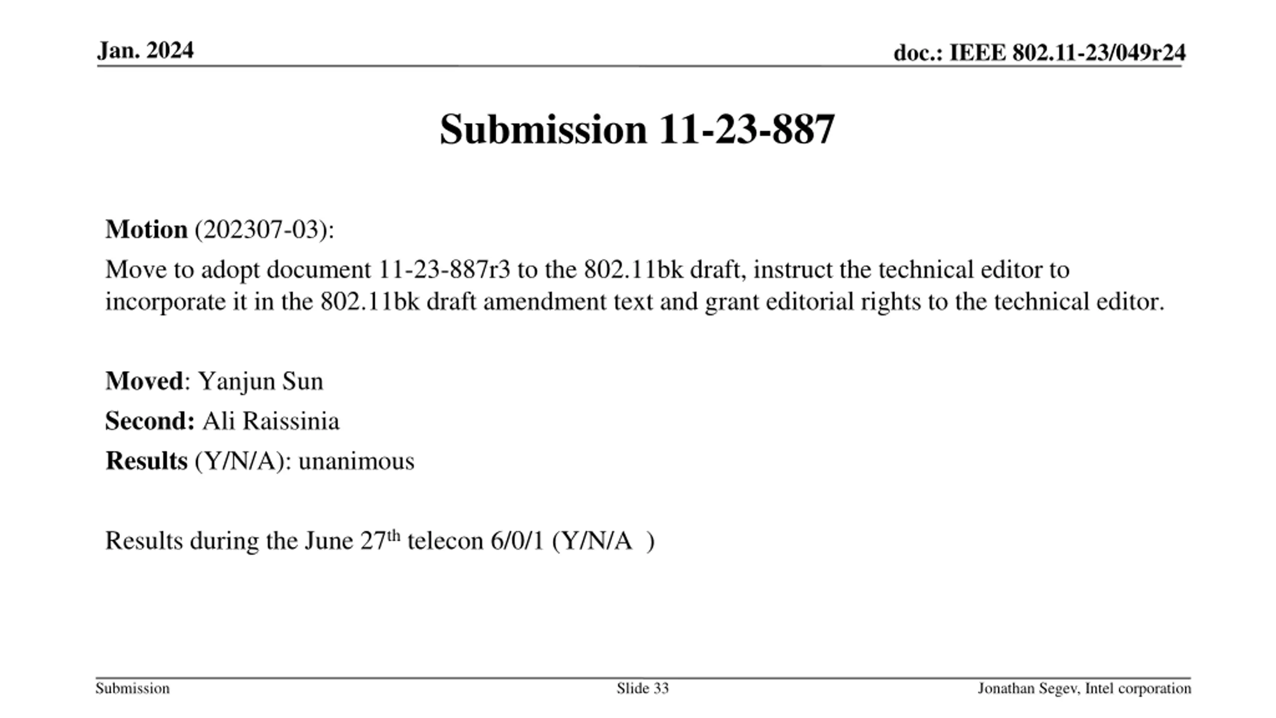 Jan. 2024 doc.: IEEE 802.11-23/049r24 Submission 11-23-887 Motion (202307-03): Move to adopt document 11-23-887r3 to the 802.11bk draft, instruct the technical editor to incorporate it in the 802.11bk draft amendment text and grant editorial rights to the technical editor. Moved: Yanjun Sun Second: Ali Raissinia Results (Y/N/A): unanimous Results during the June 27th telecon 6/0/1 (Y/N/A ) Submission Slide 33 Jonathan Segev, Intel corporation