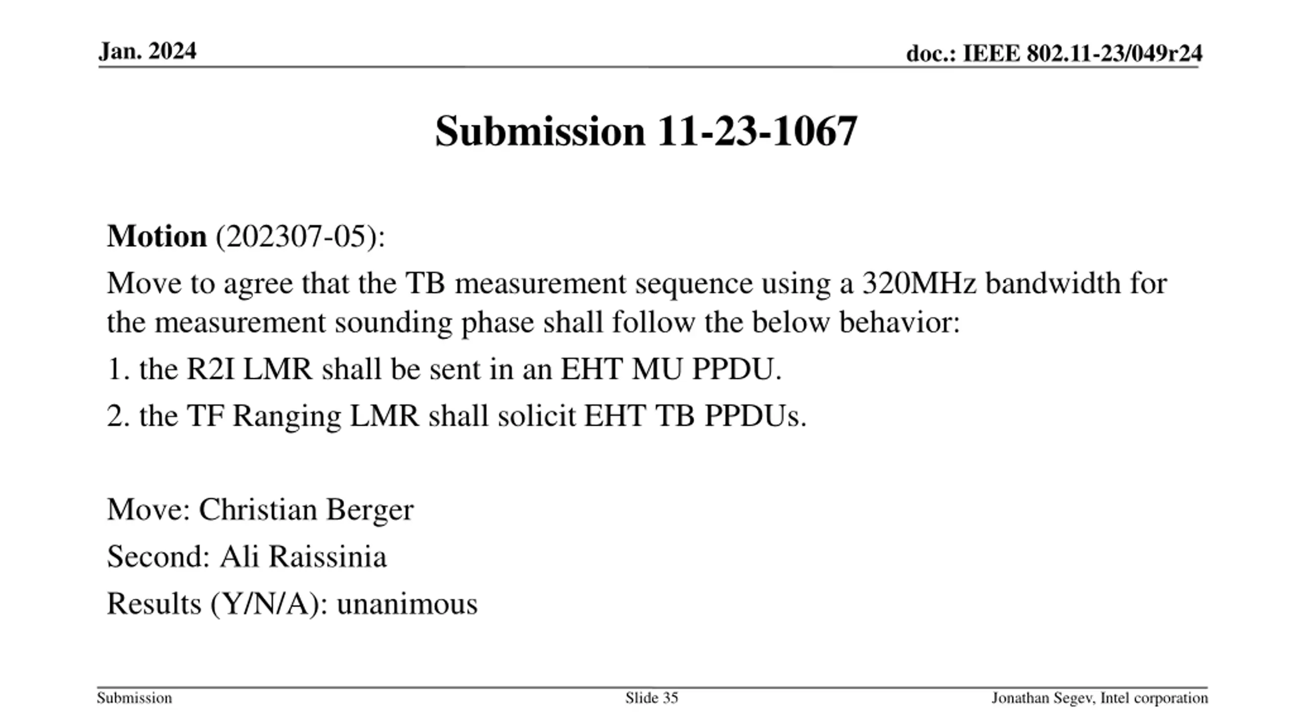 Jan. 2024 doc.: IEEE 802.11-23/049r24 Submission 11-23-1067 Motion (202307-05): Move to agree that the TB measurement sequence using a 320MHz bandwidth for the measurement sounding phase shall follow the below behavior: 1. the R2I LMR shall be sent in an EHT MU PPDU. 2. the TF Ranging LMR shall solicit EHT TB PPDUs. Move: Christian Berger Second: Ali Raissinia Results (Y/N/A): unanimous Submission Slide 35 Jonathan Segev, Intel corporation
