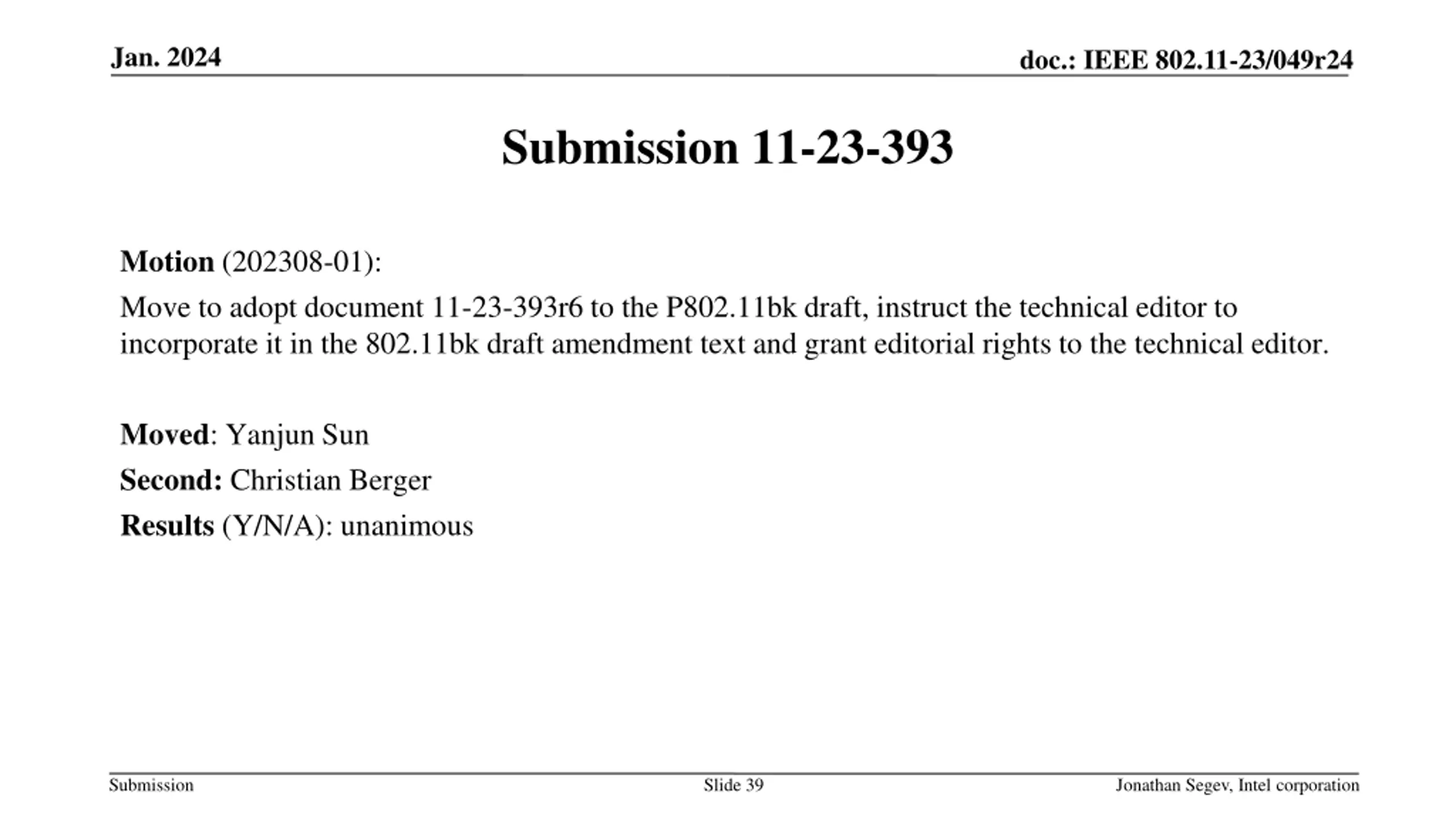 Jan. 2024 doc.: IEEE 802.11-23/049r24 Submission 11-23-393 Motion (202308-01): Move to adopt document 11-23-393r6 to the P802.11bk draft, instruct the technical editor to incorporate it in the 802.11bk draft amendment text and grant editorial rights to the technical editor. Moved: Yanjun Sun Second: Christian Berger Results (Y/N/A): unanimous Submission Slide 39 Jonathan Segev, Intel corporation