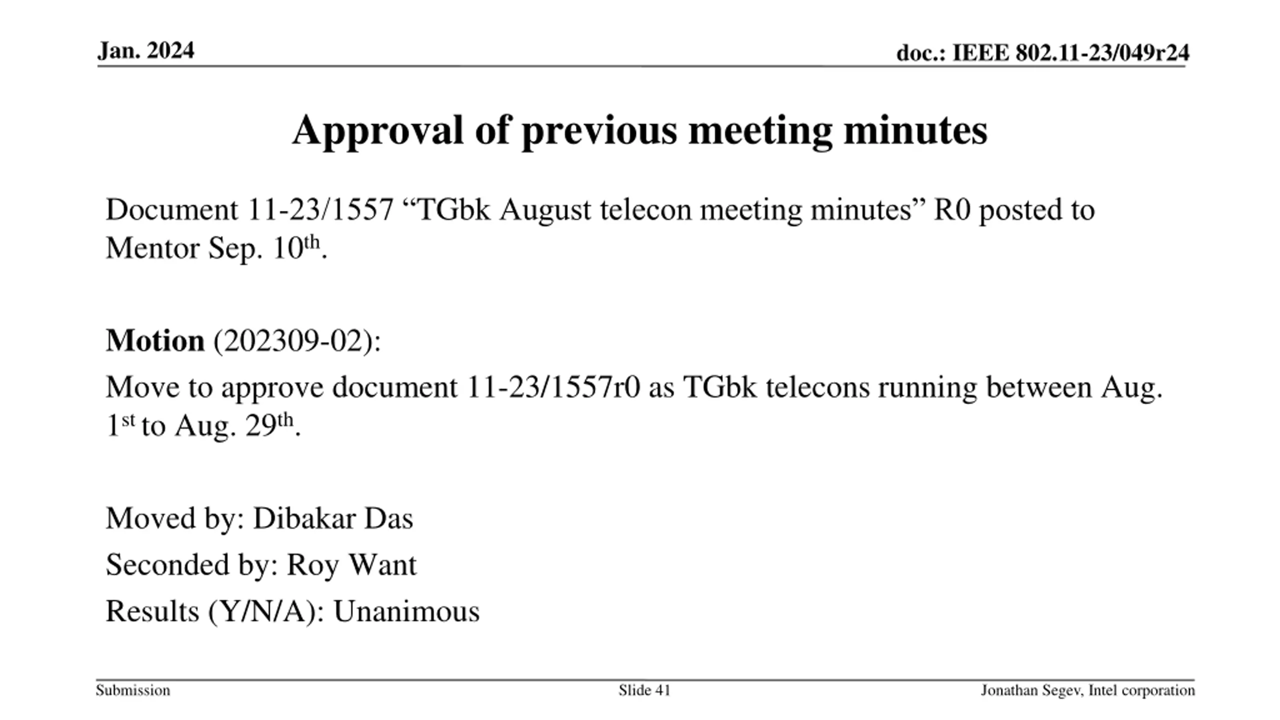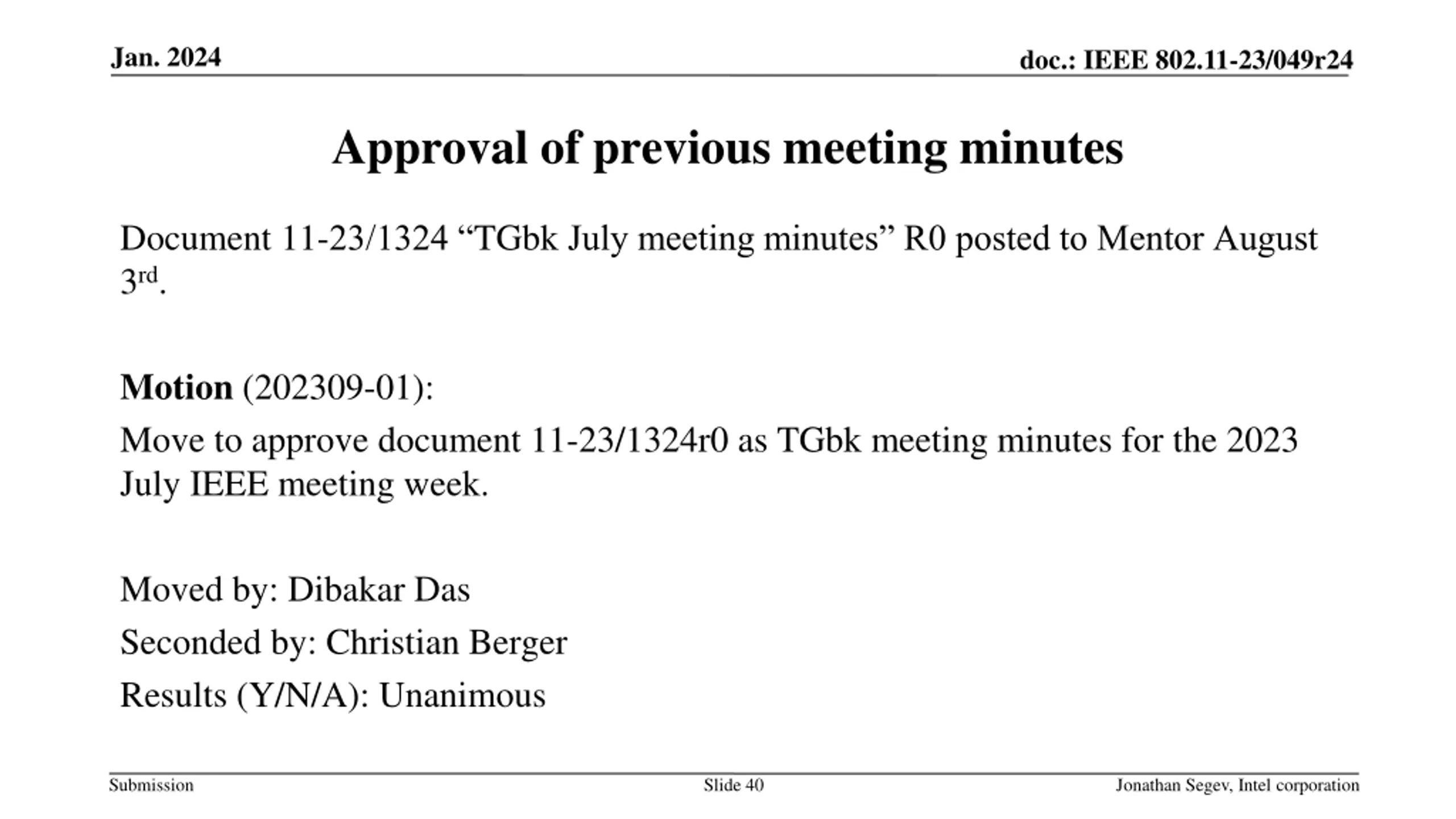 Jan. 2024 doc.: IEEE 802.11-23/049r24 Approval of previous meeting minutes Document 11-23/1324 TGbk July meeting minutes R0 posted to Mentor August 3rd. Motion (202309-01): Move to approve document 11-23/1324r0 as TGbk meeting minutes for the 2023 July IEEE meeting week. Moved by: Dibakar Das Seconded by: Christian Berger Results (Y/N/A): Unanimous Submission Slide 40 Jonathan Segev, Intel corporation
