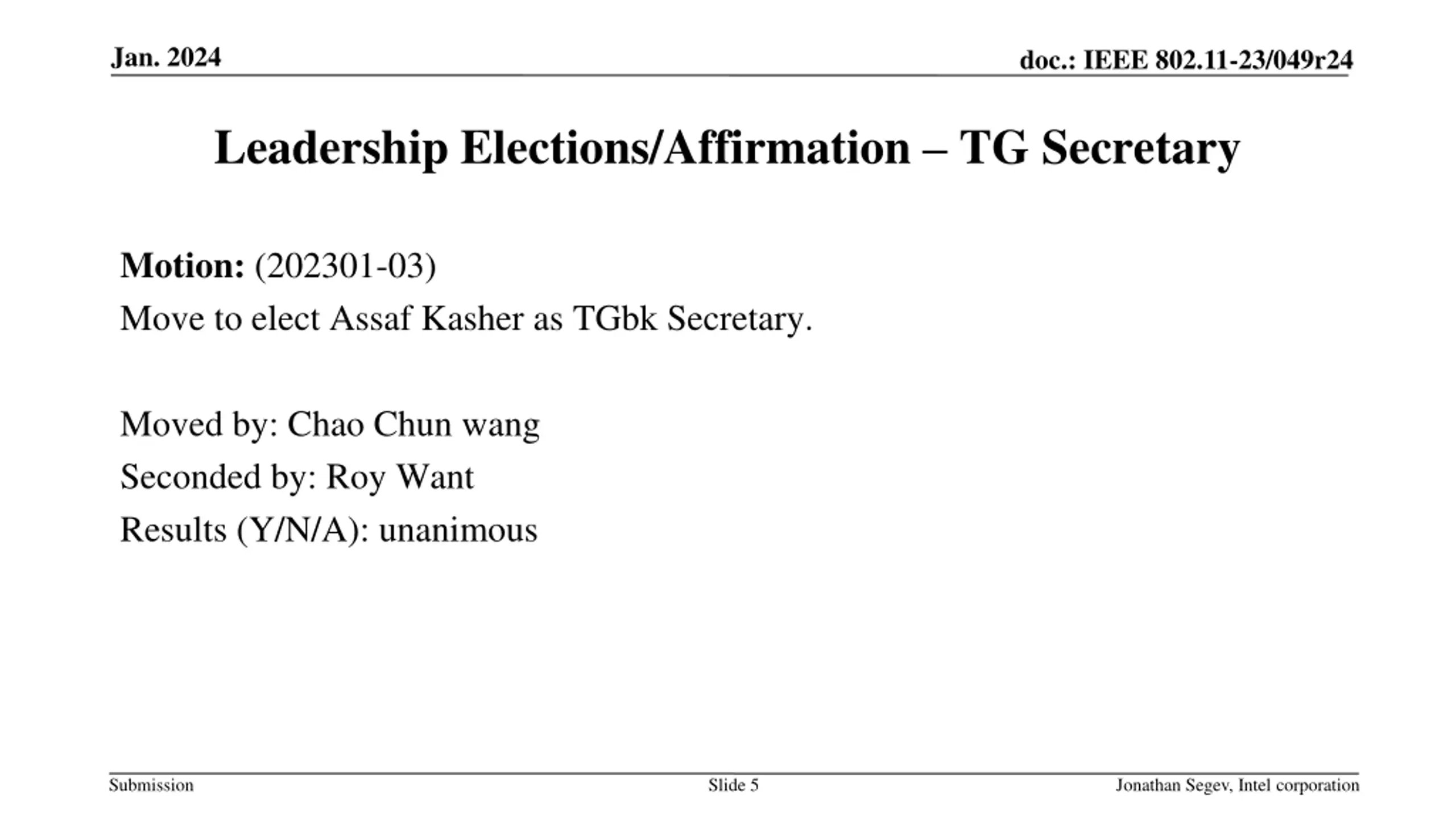 Jan. 2024 doc.: IEEE 802.11-23/049r24 Leadership Elections/Affirmation TG Secretary Motion: (202301-03) Move to elect Assaf Kasher as TGbk Secretary. Moved by: Chao Chun wang Seconded by: Roy Want Results (Y/N/A): unanimous Submission Slide 5 Jonathan Segev, Intel corporation