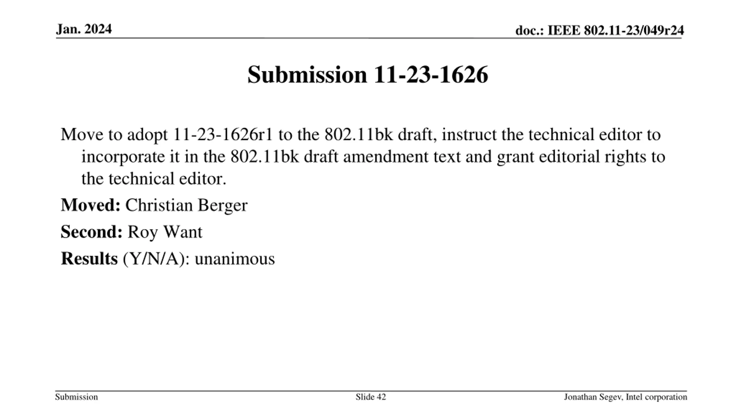 Jan. 2024 doc.: IEEE 802.11-23/049r24 Submission 11-23-1626 Move to adopt 11-23-1626r1 to the 802.11bk draft, instruct the technical editor to incorporate it in the 802.11bk draft amendment text and grant editorial rights to the technical editor. Moved: Christian Berger Second: Roy Want Results (Y/N/A): unanimous Submission Slide 42 Jonathan Segev, Intel corporation