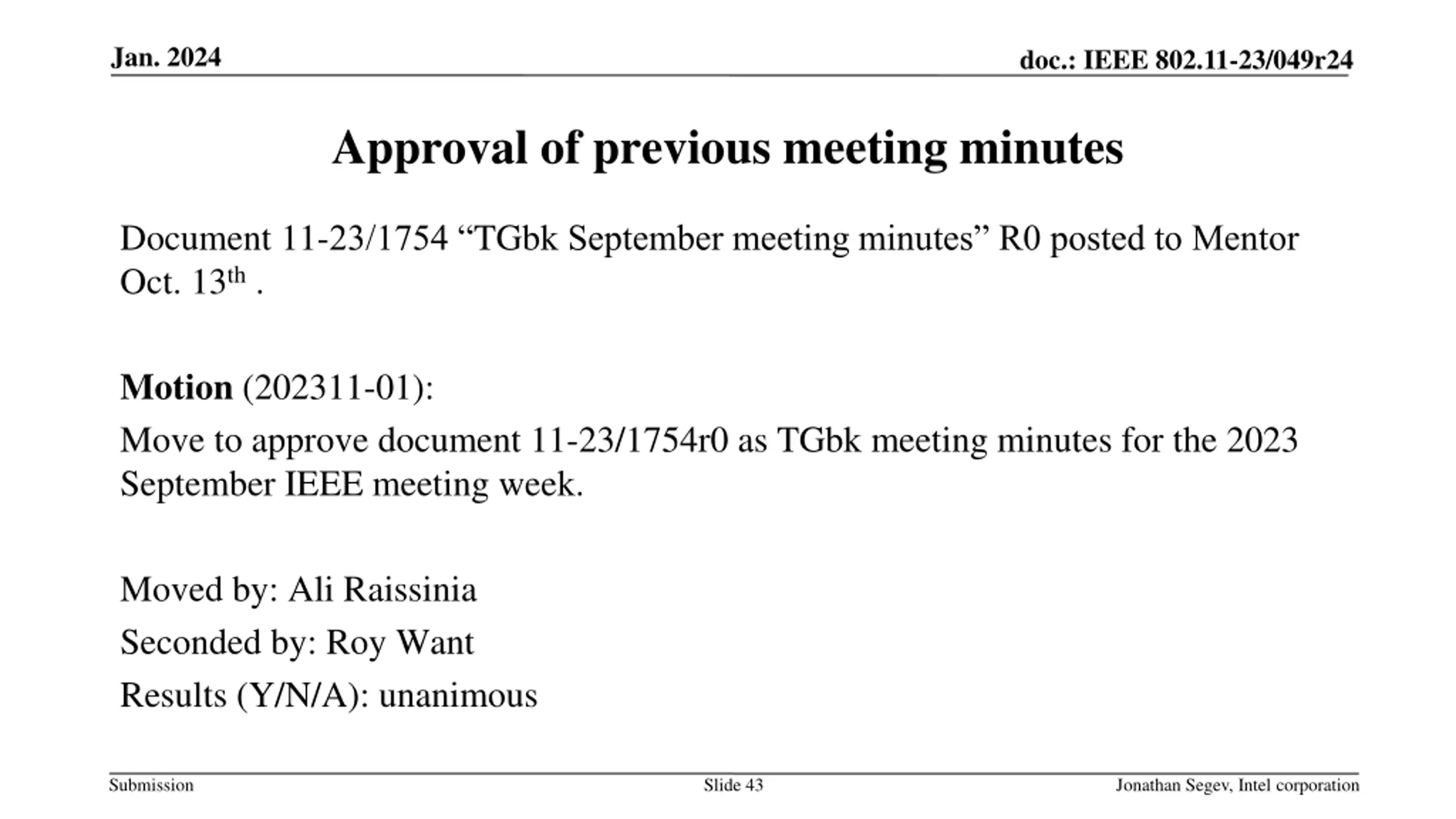 Jan. 2024 doc.: IEEE 802.11-23/049r24 Approval of previous meeting minutes Document 11-23/1754 TGbk September meeting minutes R0 posted to Mentor Oct. 13th . Motion (202311-01): Move to approve document 11-23/1754r0 as TGbk meeting minutes for the 2023 September IEEE meeting week. Moved by: Ali Raissinia Seconded by: Roy Want Results (Y/N/A): unanimous Submission Slide 43 Jonathan Segev, Intel corporation