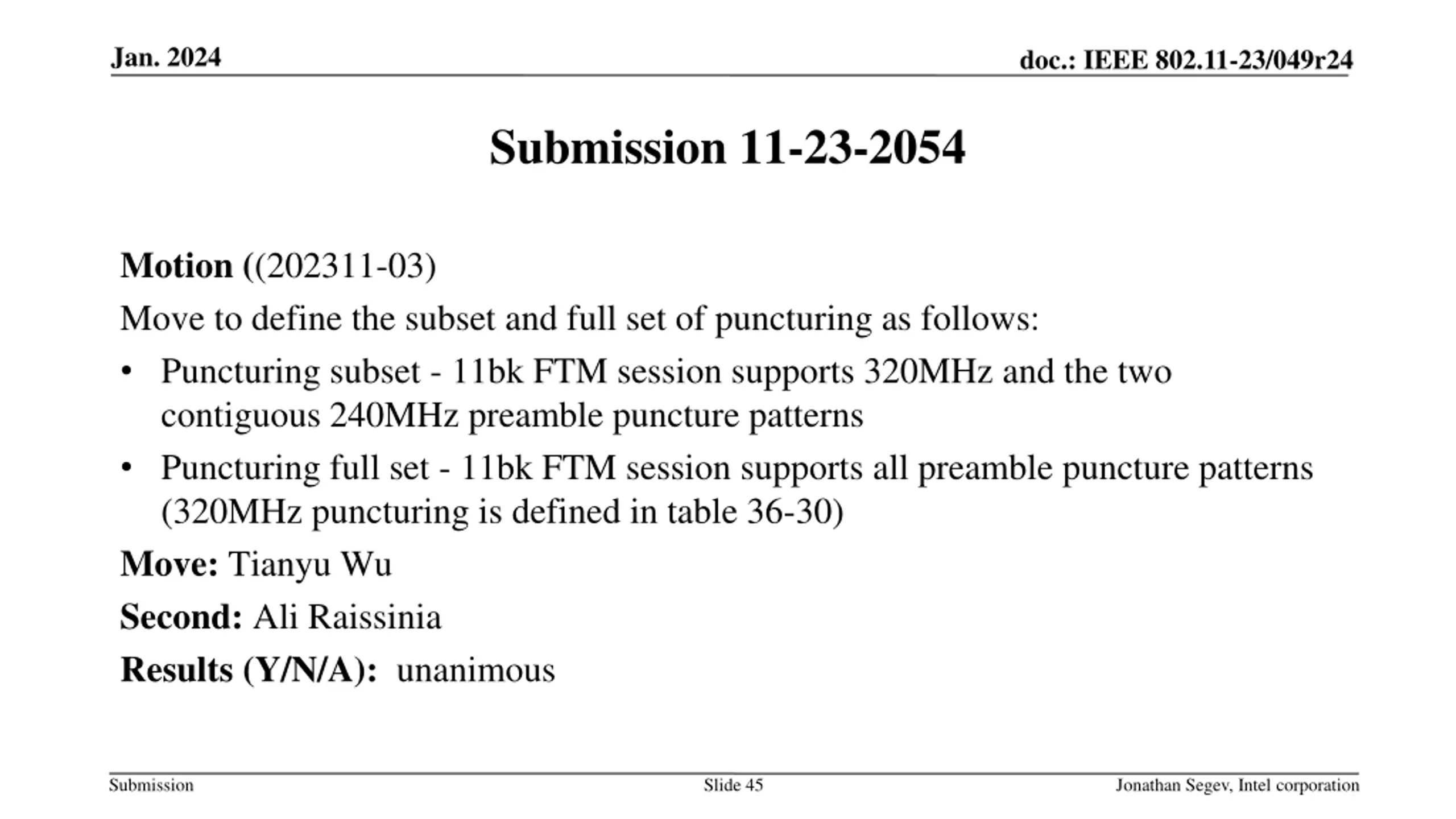 Jan. 2024 doc.: IEEE 802.11-23/049r24 Submission 11-23-2054 Motion ((202311-03) Move to define the subset and full set of puncturing as follows: Puncturing subset - 11bk FTM session supports 320MHz and the two contiguous 240MHz preamble puncture patterns Puncturing full set - 11bk FTM session supports all preamble puncture patterns (320MHz puncturing is defined in table 36-30) Move: Tianyu Wu Second: Ali Raissinia Results (Y/N/A): unanimous Submission Slide 45 Jonathan Segev, Intel corporation