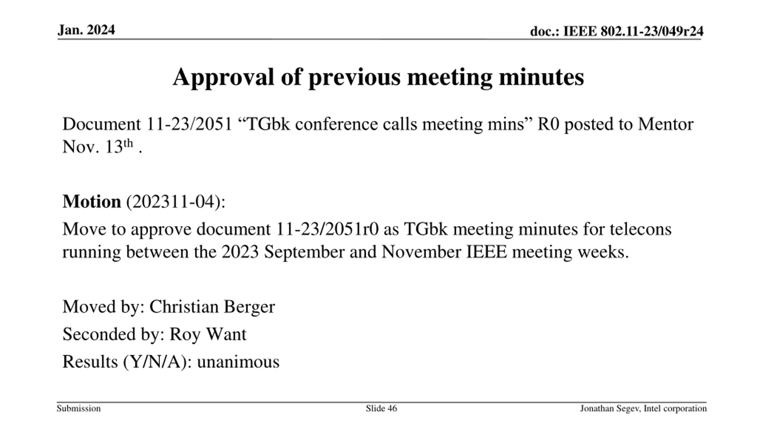 Jan. 2024 doc.: IEEE 802.11-23/049r24 Approval of previous meeting minutes Document 11-23/2051 TGbk conference calls meeting mins R0 posted to Mentor Nov. 13th . Motion (202311-04): Move to approve document 11-23/2051r0 as TGbk meeting minutes for telecons running between the 2023 September and November IEEE meeting weeks. Moved by: Christian Berger Seconded by: Roy Want Results (Y/N/A): unanimous Submission Slide 46 Jonathan Segev, Intel corporation