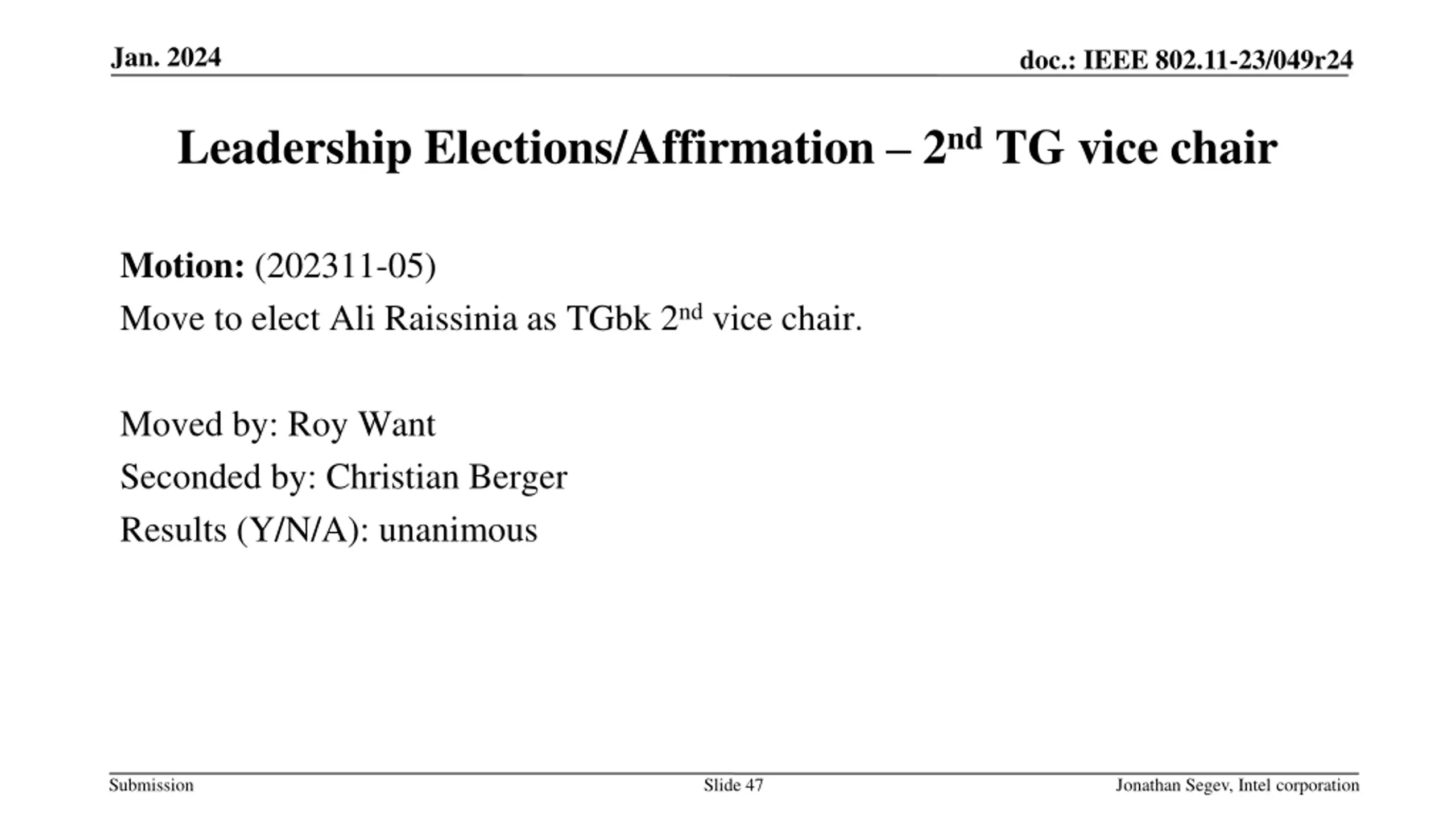Jan. 2024 doc.: IEEE 802.11-23/049r24 Leadership Elections/Affirmation 2nd TG vice chair Motion: (202311-05) Move to elect Ali Raissinia as TGbk 2nd vice chair. Moved by: Roy Want Seconded by: Christian Berger Results (Y/N/A): unanimous Submission Slide 47 Jonathan Segev, Intel corporation
