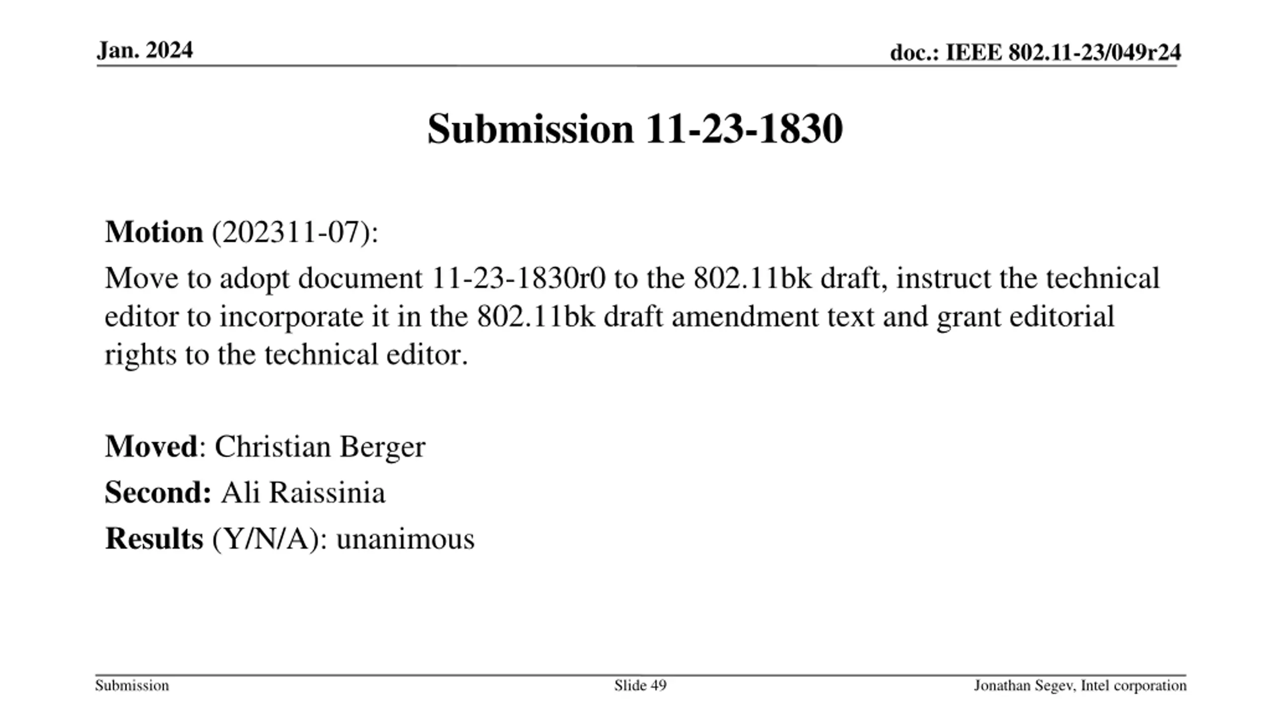 Jan. 2024 doc.: IEEE 802.11-23/049r24 Submission 11-23-2066 Motion (202311-06): Move to adopt document 11-23-2066r1to the 802.11bk draft, instruct the technical editor to incorporate it in the 802.11bk draft amendment text and grant editorial rights to the technical editor. Moved: Christian Berger Second: Ali Raissinia Results (Y/N/A): unanimous Submission Slide 48 Jonathan Segev, Intel corporation