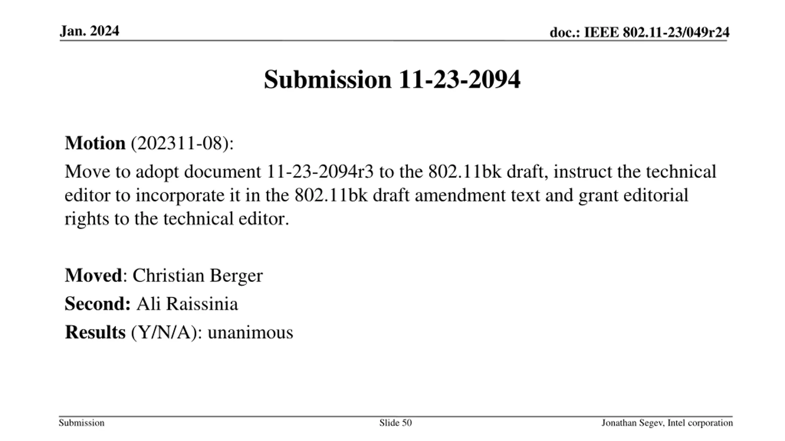Jan. 2024 doc.: IEEE 802.11-23/049r24 Submission 11-23-2094 Motion (202311-08): Move to adopt document 11-23-2094r3 to the 802.11bk draft, instruct the technical editor to incorporate it in the 802.11bk draft amendment text and grant editorial rights to the technical editor. Moved: Christian Berger Second: Ali Raissinia Results (Y/N/A): unanimous Submission Slide 50 Jonathan Segev, Intel corporation
